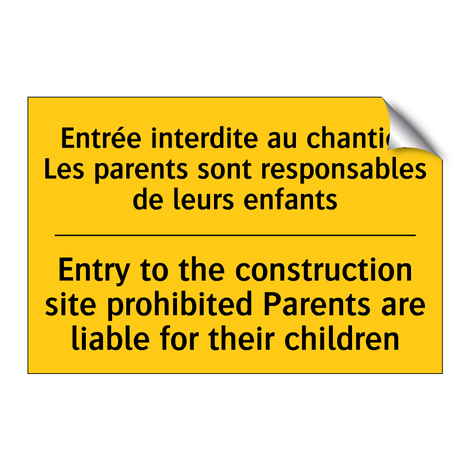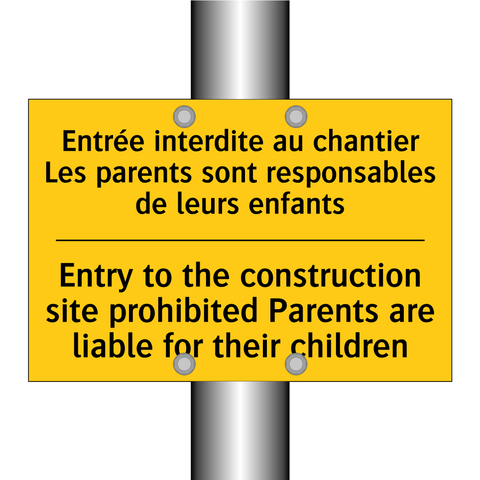 Panneau d'avertissement bilingue avec texte en français : "Entrée interdite au chantier Les parents sont responsables de leurs enfants", et en anglais : "Entry to the construction site prohibited Parents are liable for their children"