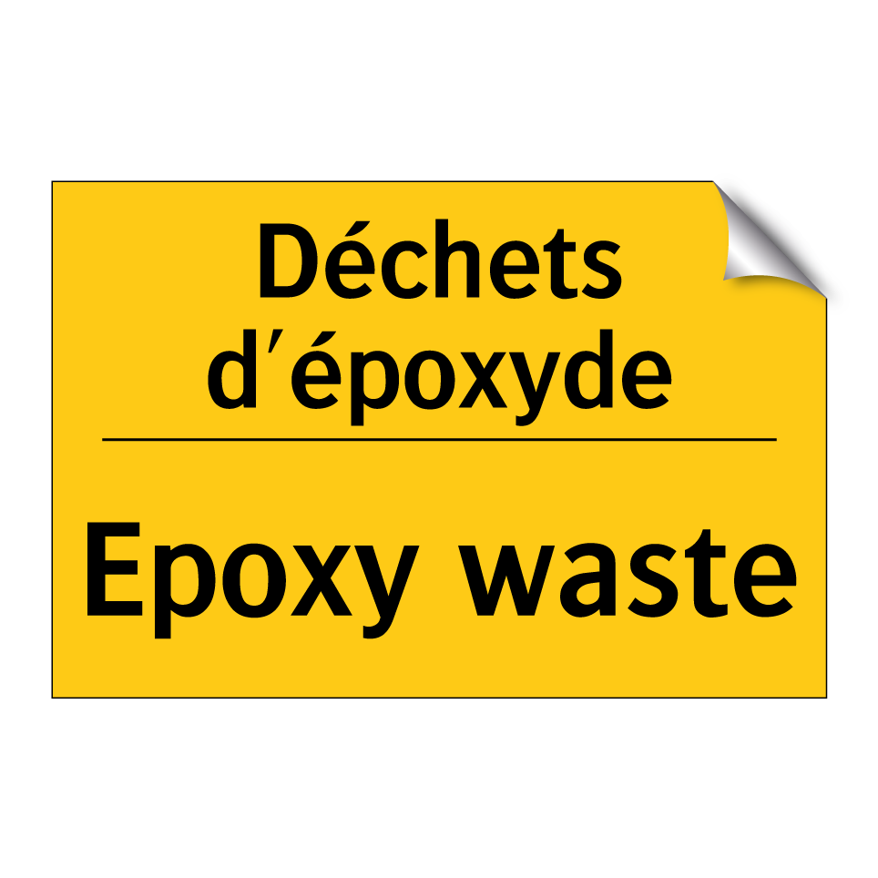 Panneau d'avertissement bilingue avec texte en français : "Déchets d'époxyde", et en anglais : "Epoxy waste"
