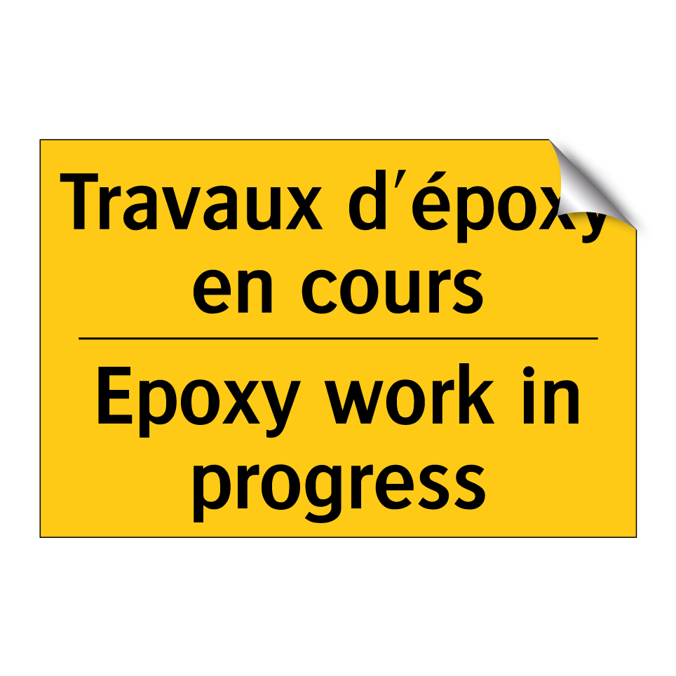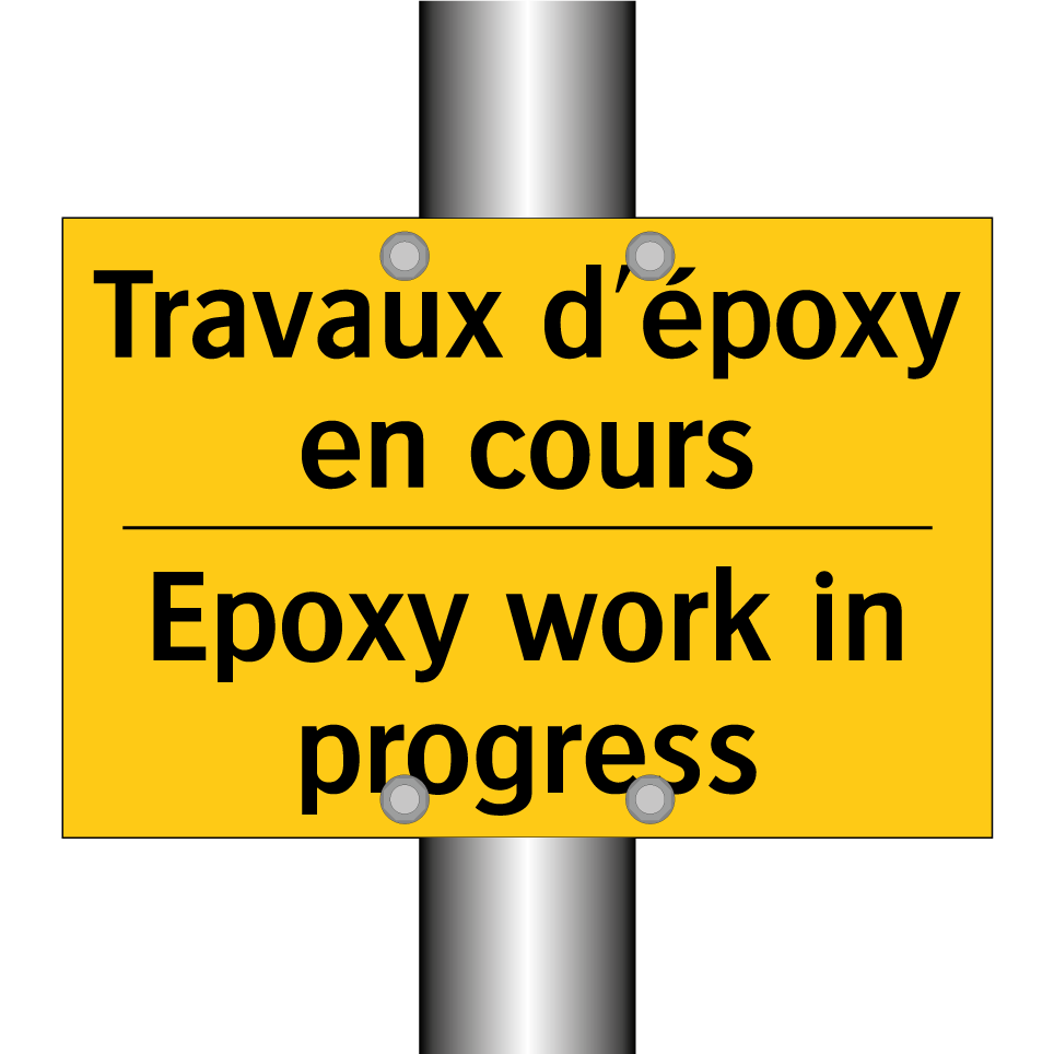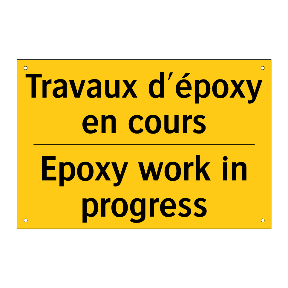 Panneau d'avertissement bilingue avec texte en français : "Travaux d'époxy en cours", et en anglais : "Epoxy work in progress"