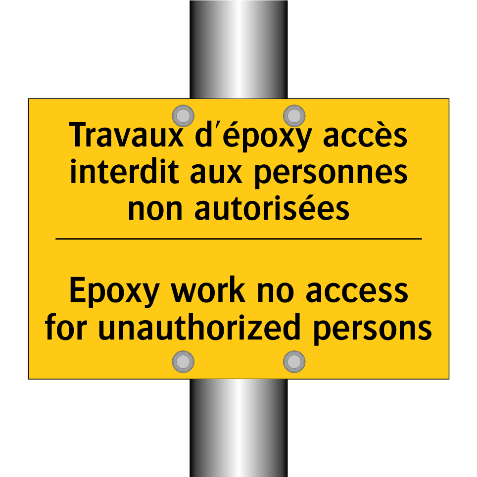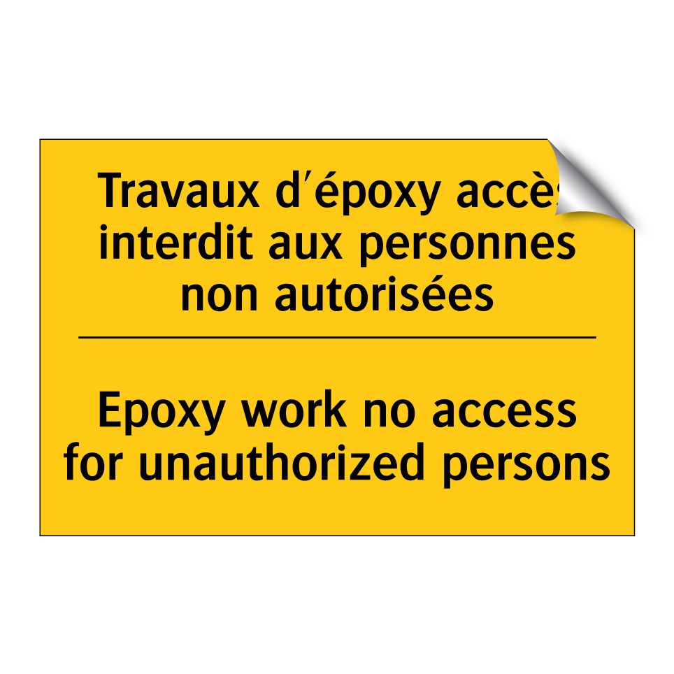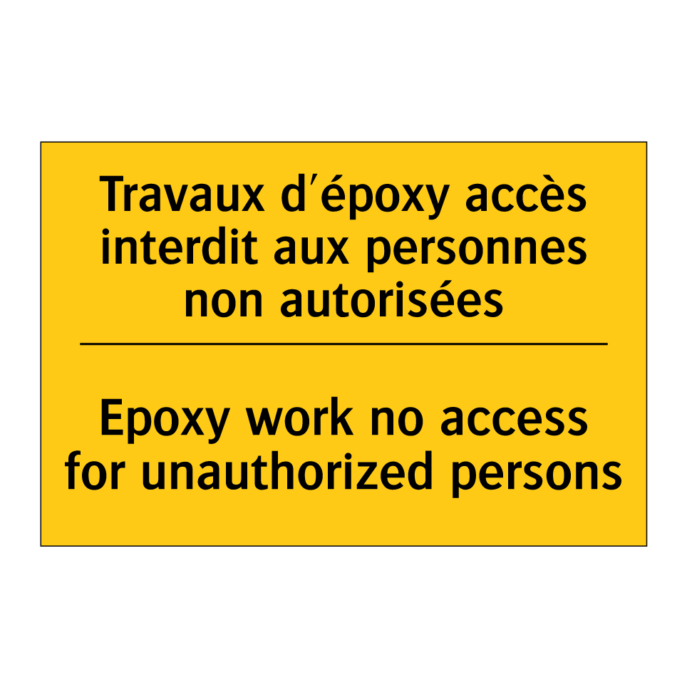 Panneau d'avertissement bilingue avec texte en français : "Travaux d'époxy accès interdit aux personnes non autorisées", et en anglais : "Epoxy work no access for unauthorized persons"