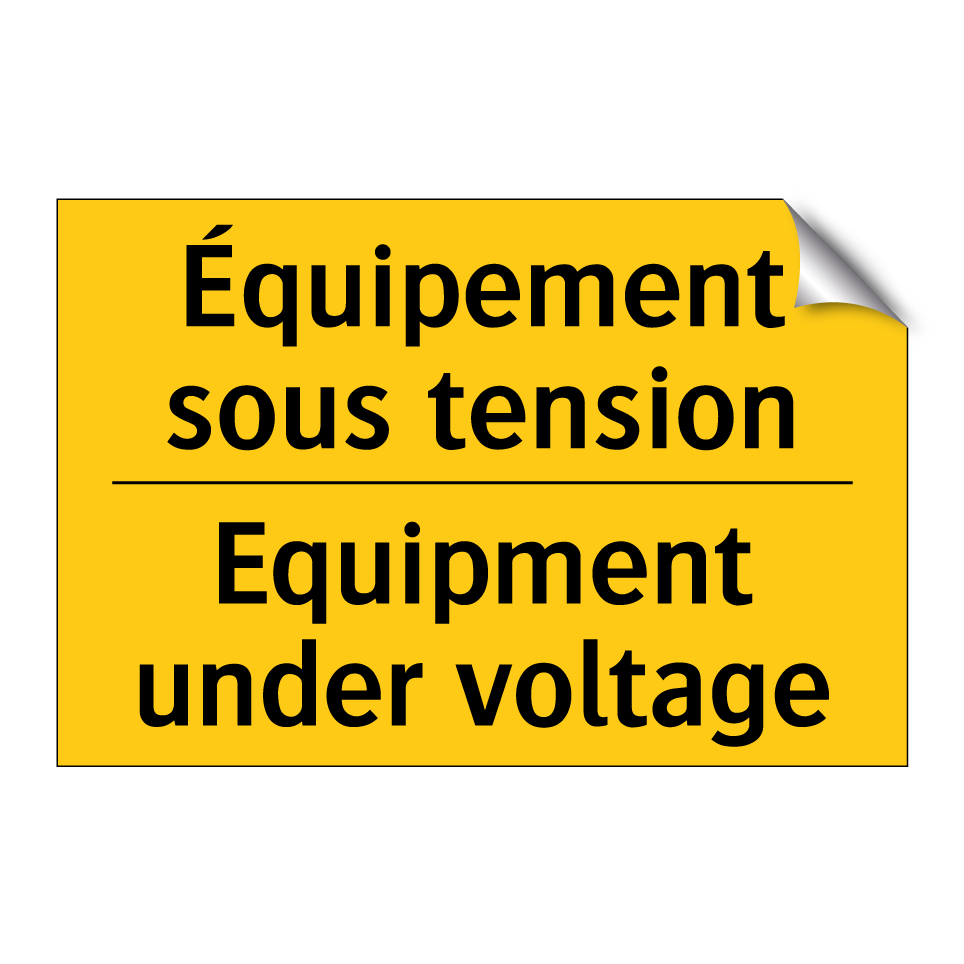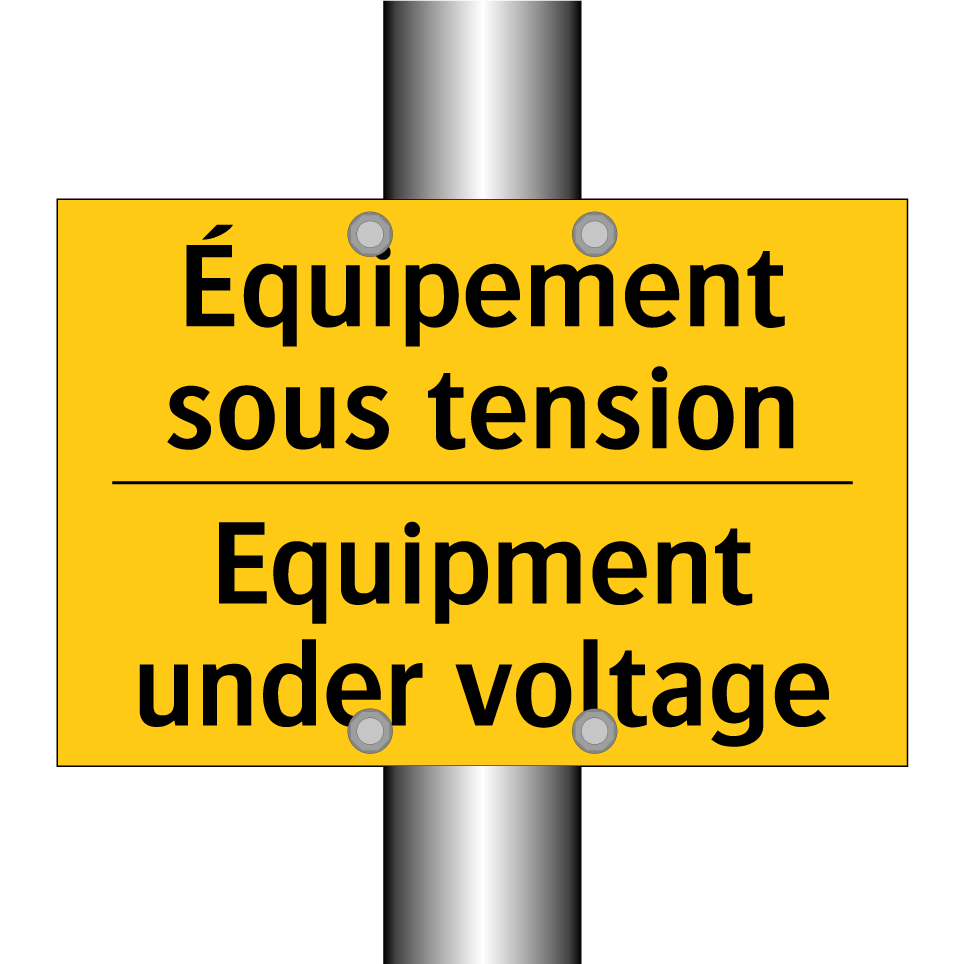 Panneau d'avertissement bilingue avec texte en français : "Équipement sous tension", et en anglais : "Equipment under voltage"