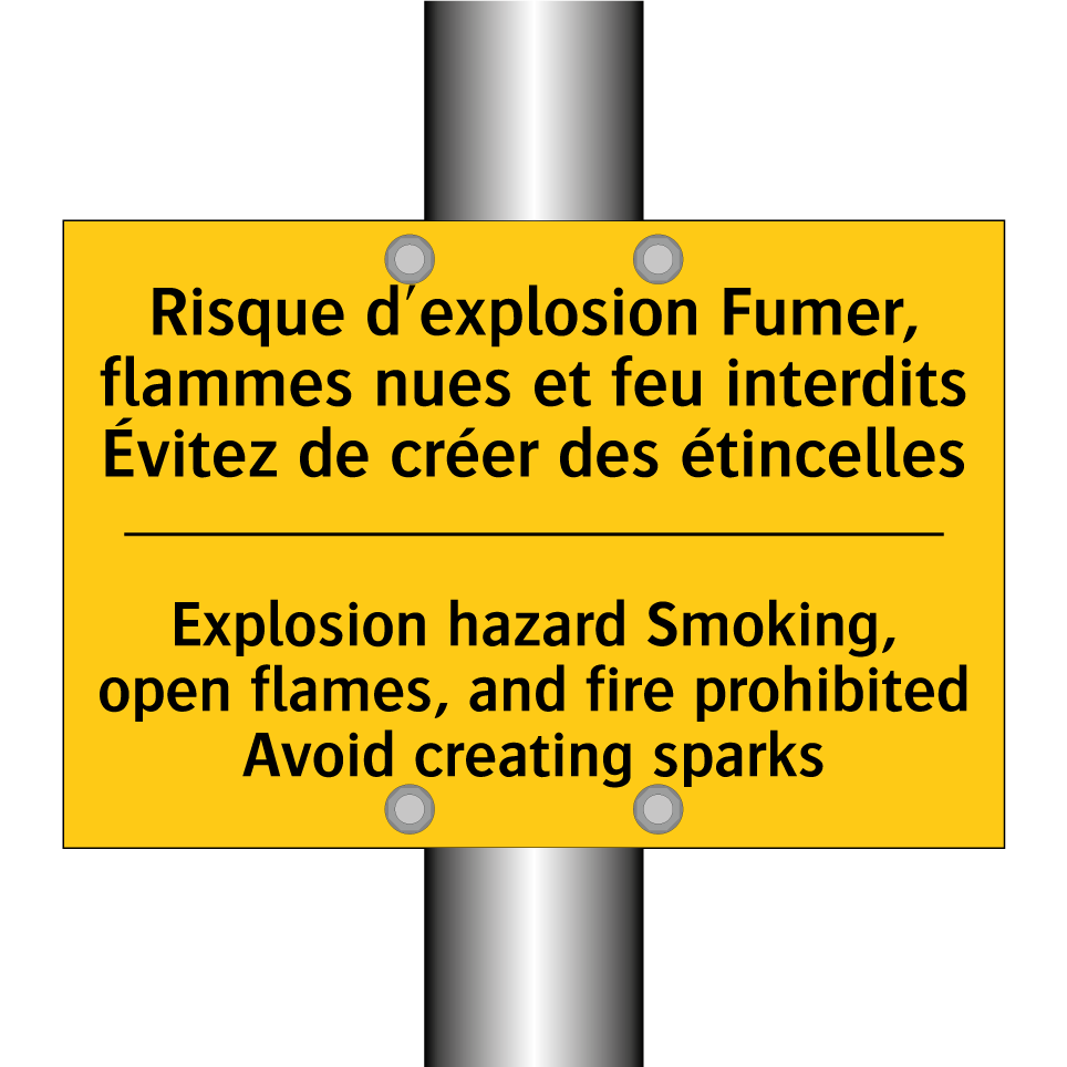 Panneau d'avertissement bilingue avec texte en français : "Risque d'explosion Fumer, flammes nues et feu interdits Évitez de créer des étincelles", et en anglais : "Explosion hazard Smoking, open flames, and fire prohibited Avoid creating sparks"
