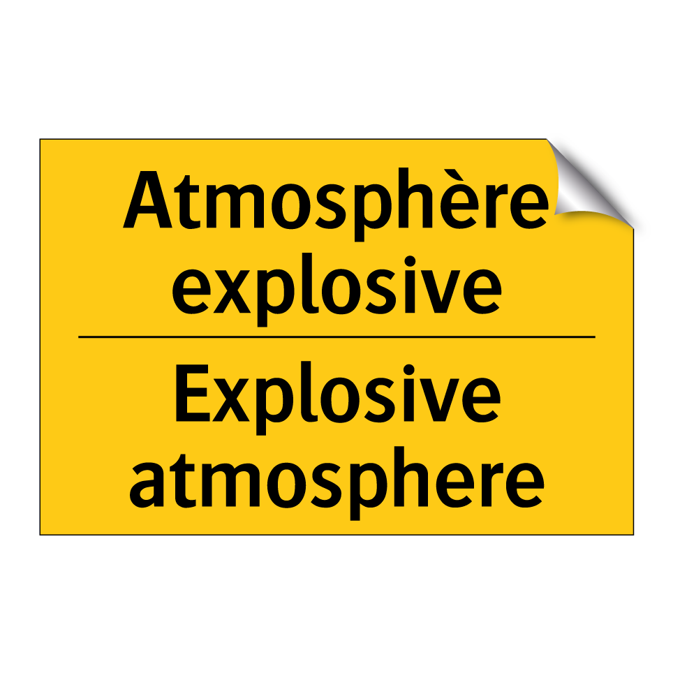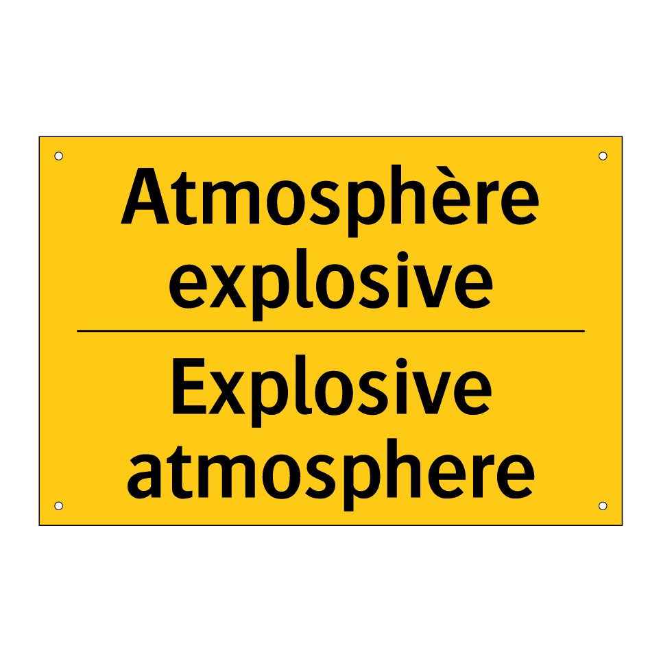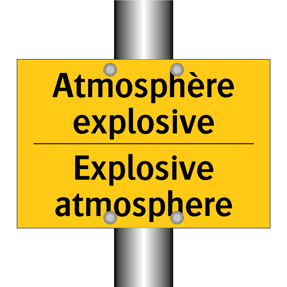 Panneau d'avertissement bilingue avec texte en français : "Atmosphère explosive", et en anglais : "Explosive atmosphere"