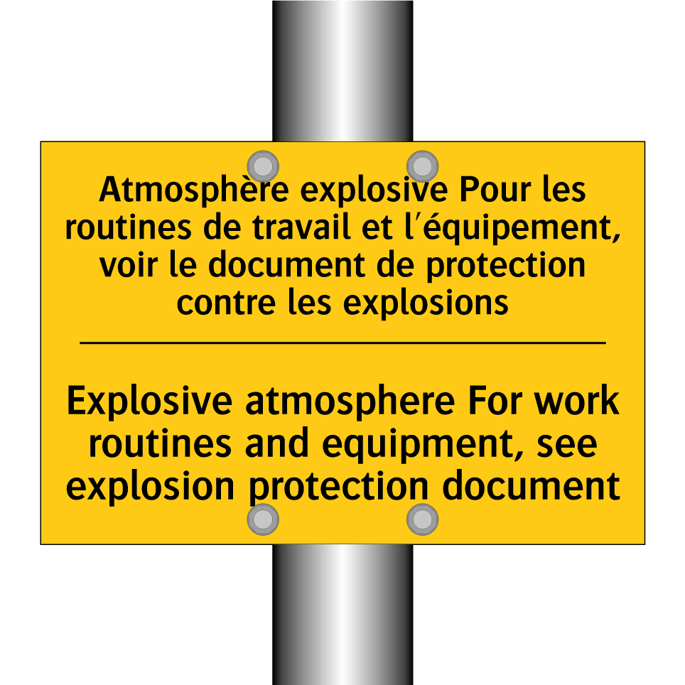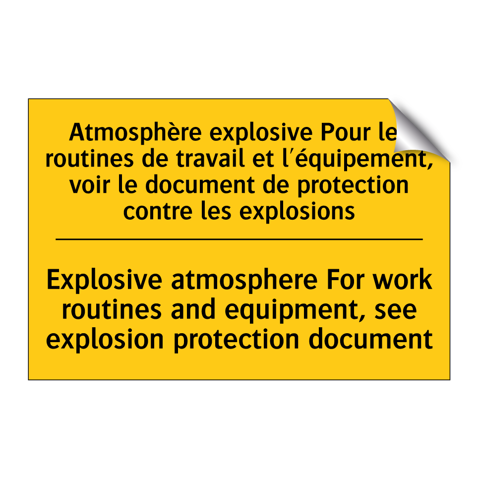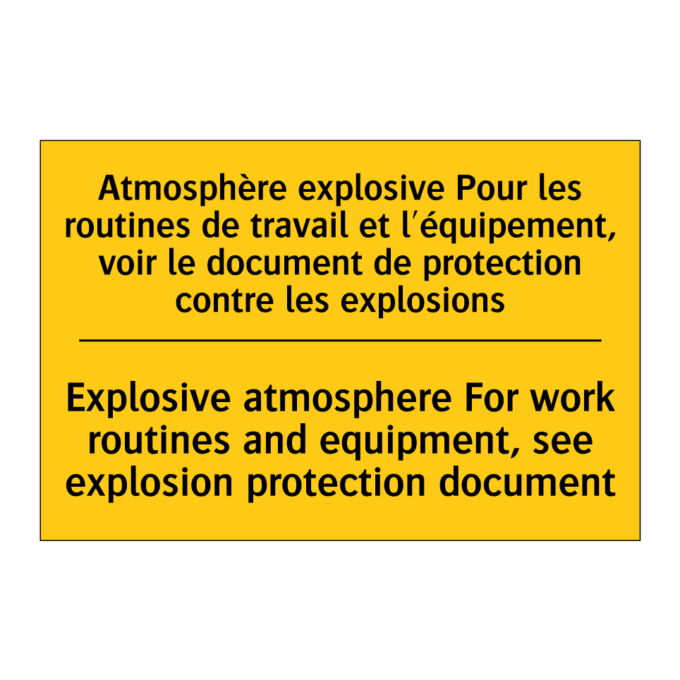 Panneau d'avertissement bilingue avec texte en français : "Atmosphère explosive Pour les routines de travail et l'équipement, voir le document de protection contre les explosions", et en anglais : "Explosive atmosphere For work routines and equipment, see explosion protection document"