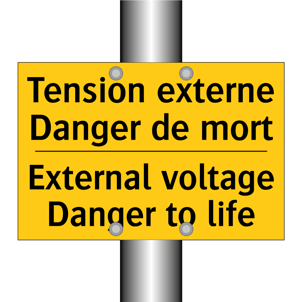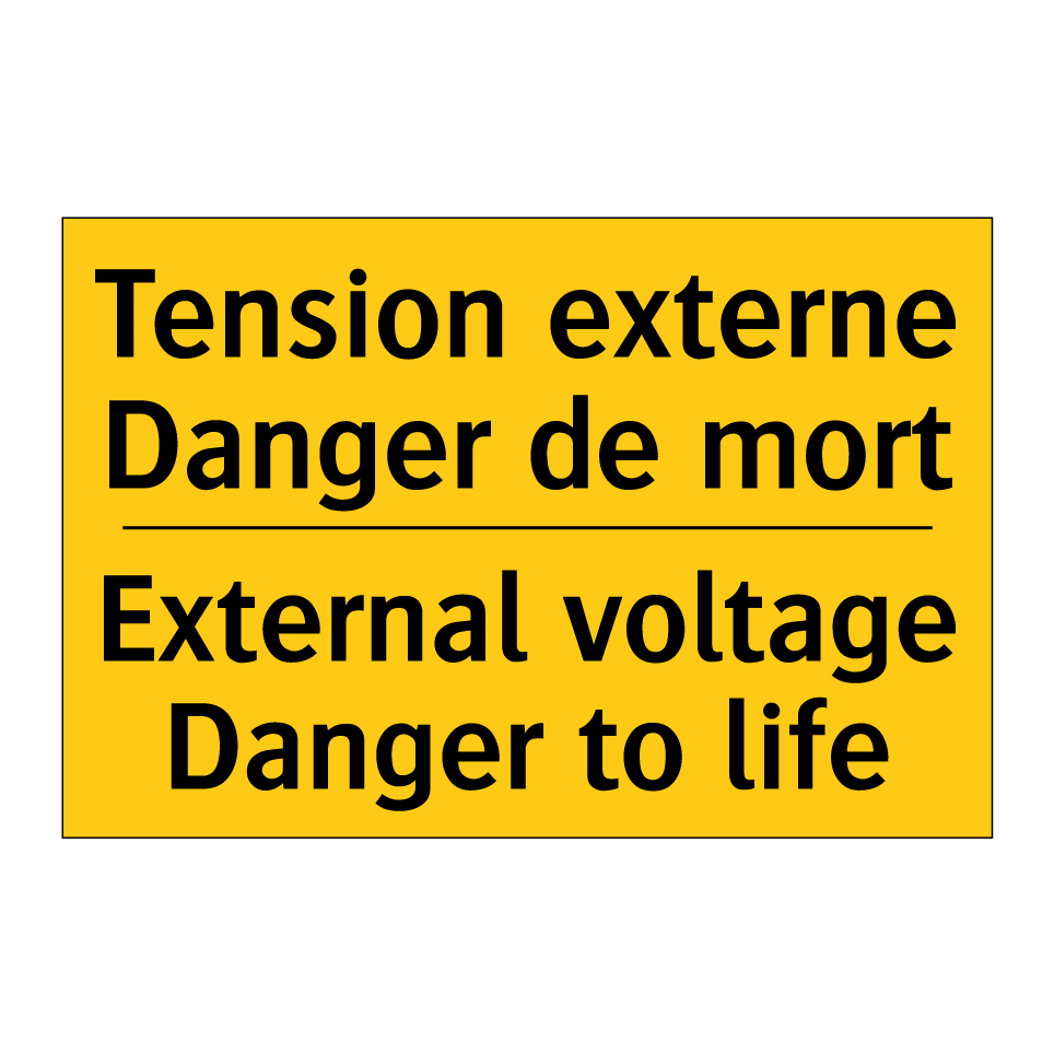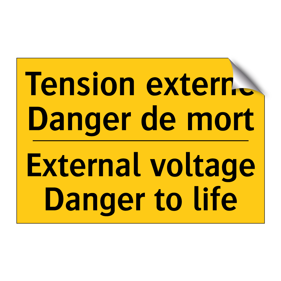 Panneau d'avertissement bilingue avec texte en français : "Tension externe Danger de mort", et en anglais : "External voltage Danger to life"