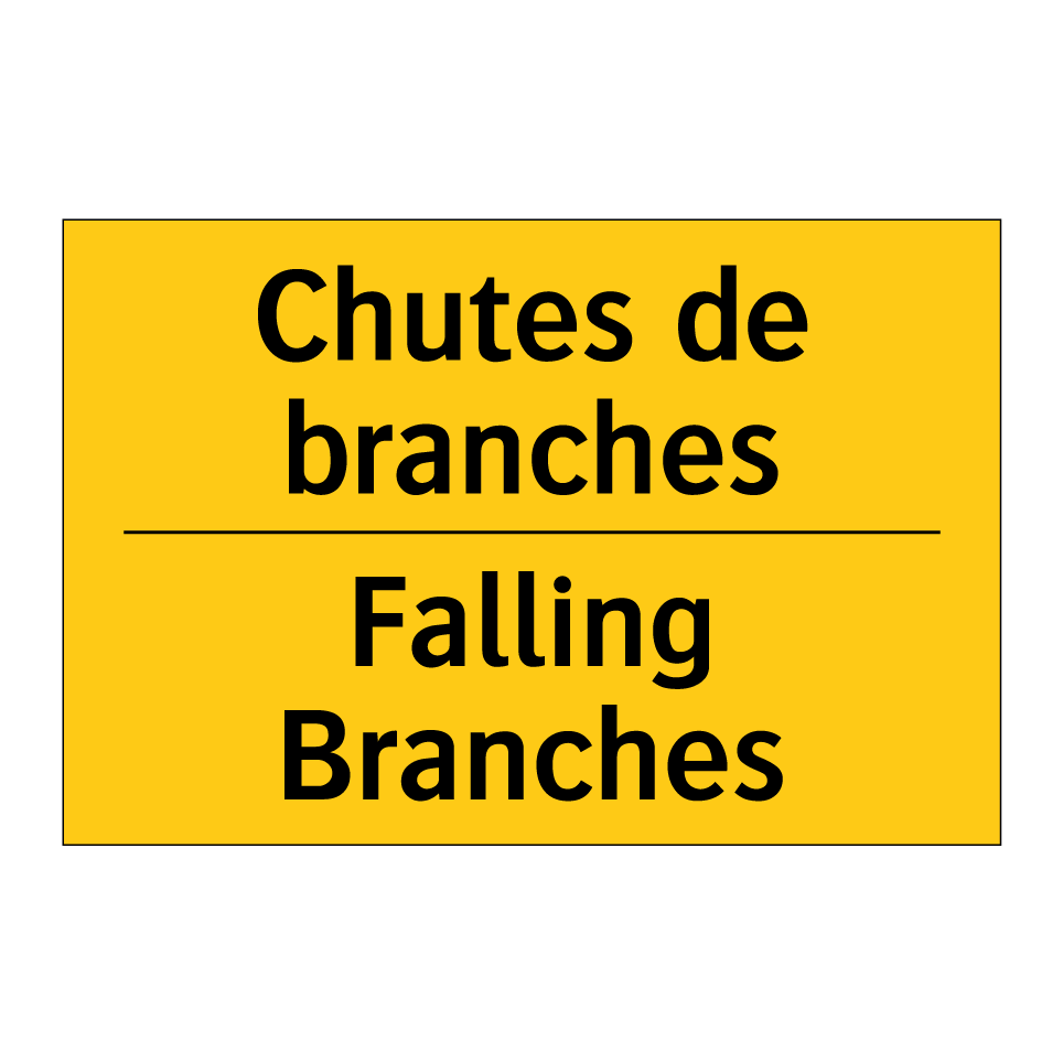 Panneau d'avertissement bilingue avec texte en français : "Chutes de branches", et en anglais : "Falling Branches"