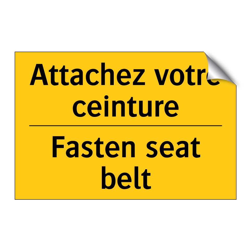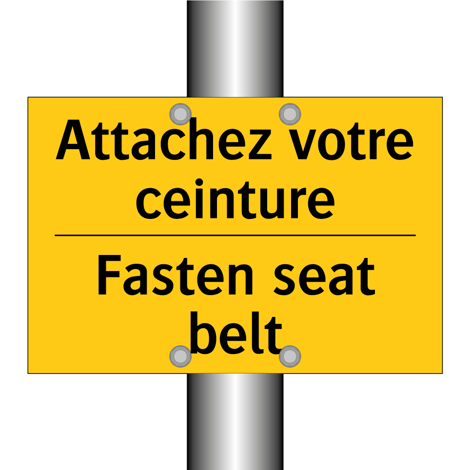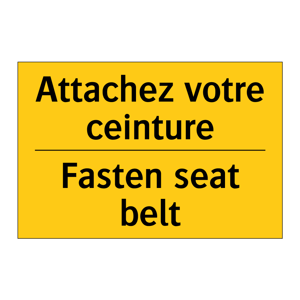 Panneau d'avertissement bilingue avec texte en français : "Attachez votre ceinture", et en anglais : "Fasten seat belt"
