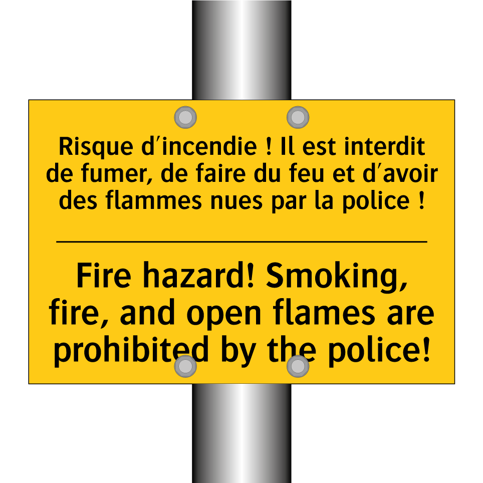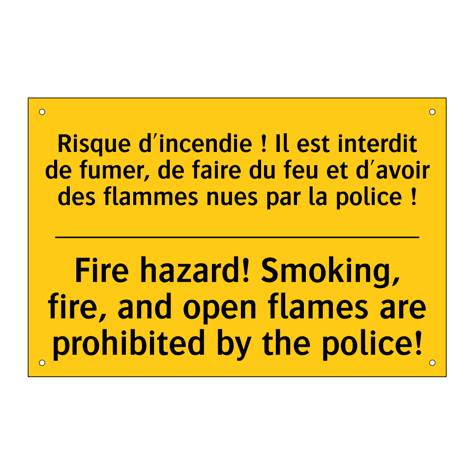 Panneau d'avertissement bilingue avec texte en français : "Risque d'incendie ! Il est interdit de fumer, de faire du feu et d'avoir des flammes nues par la police !", et en anglais : "Fire hazard! Smoking, fire, and open flames are prohibited by the police!"