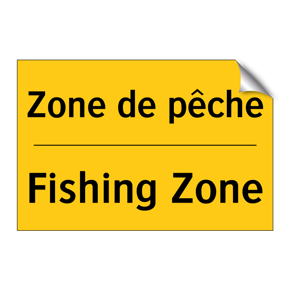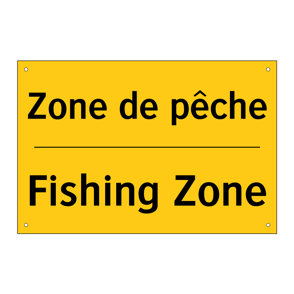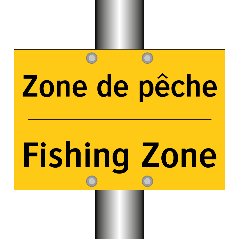 Panneau d'avertissement bilingue avec texte en français : "Zone de pêche", et en anglais : "Fishing Zone"