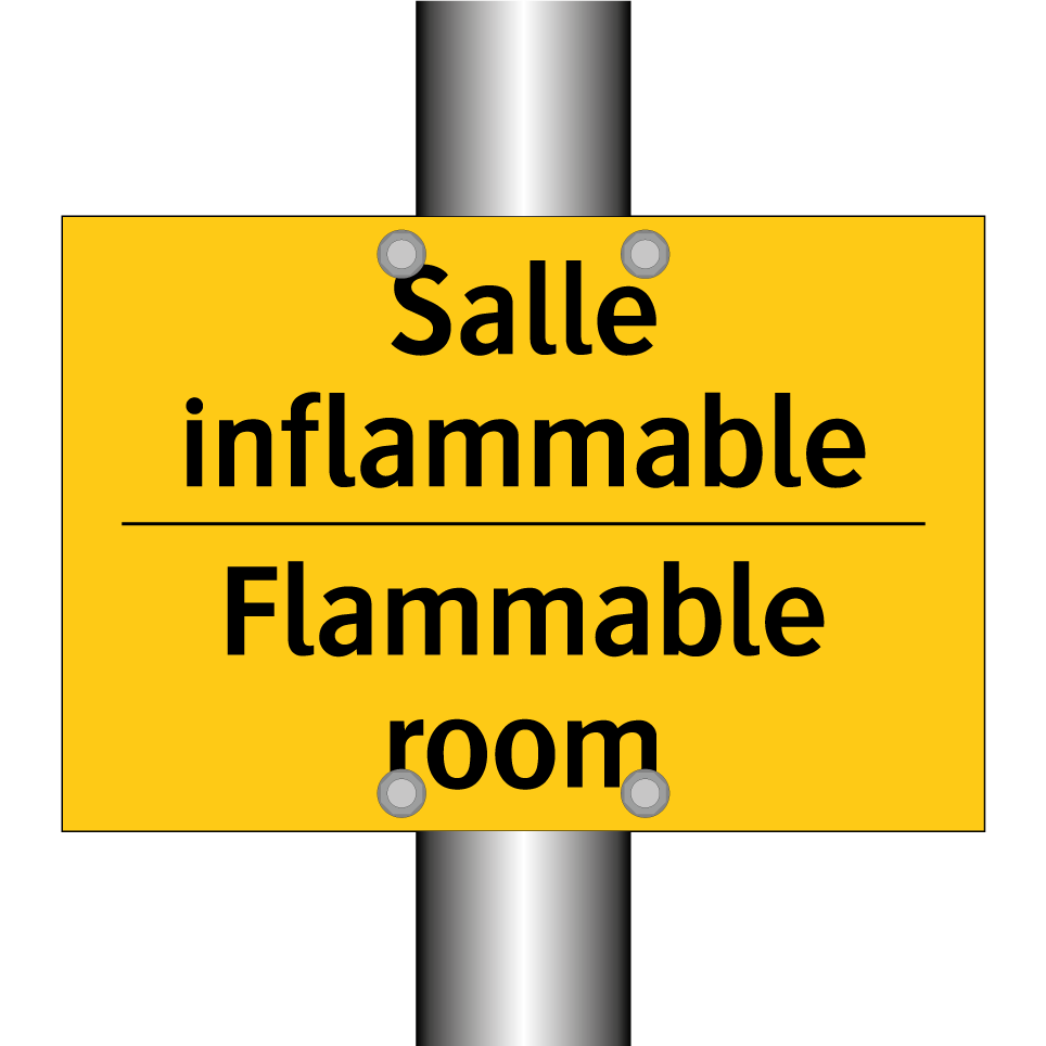 Panneau d'avertissement bilingue avec texte en français : "Salle inflammable", et en anglais : "Flammable room"