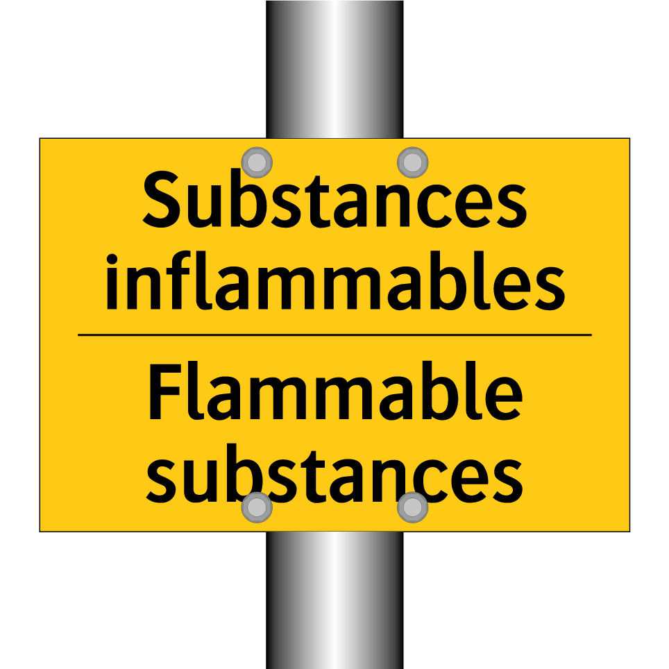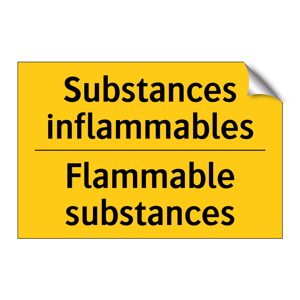 Panneau d'avertissement bilingue avec texte en français : "Substances inflammables", et en anglais : "Flammable substances"