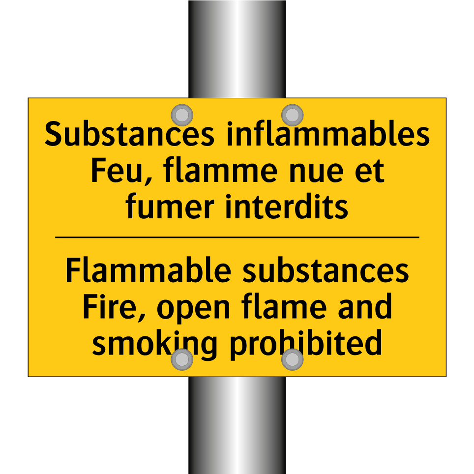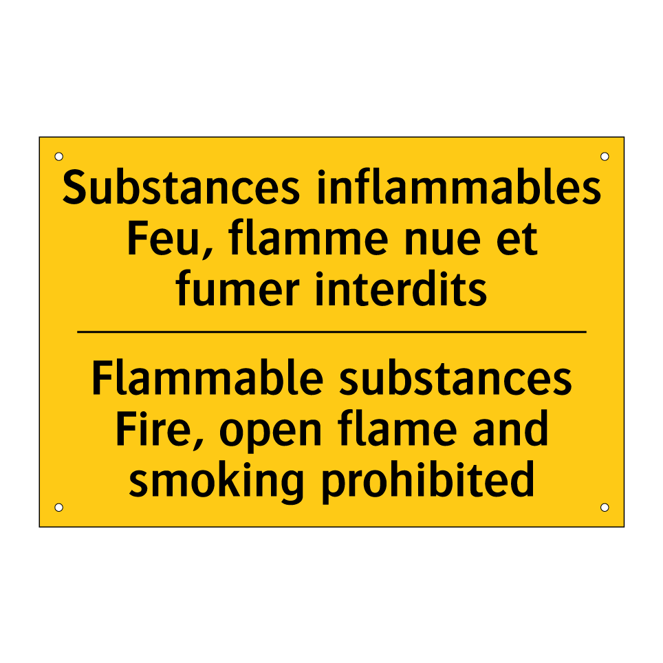 Panneau d'avertissement bilingue avec texte en français : "Substances inflammables Feu, flamme nue et fumer interdits", et en anglais : "Flammable substances Fire, open flame and smoking prohibited"