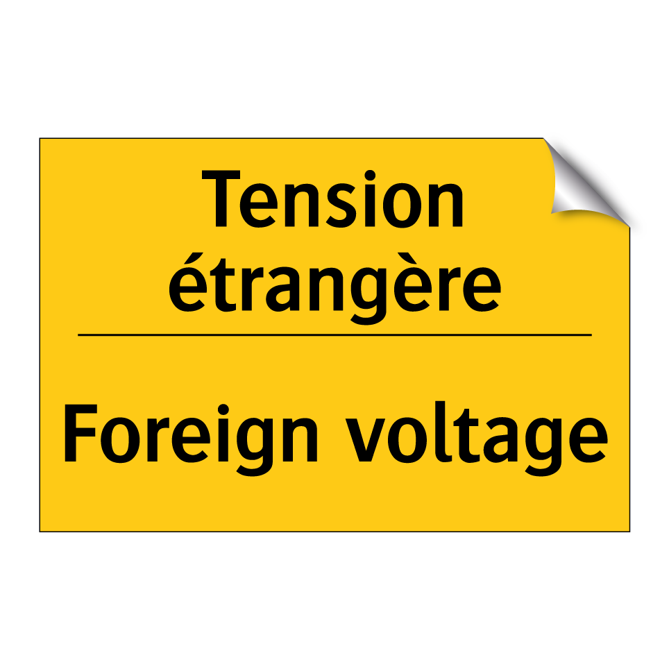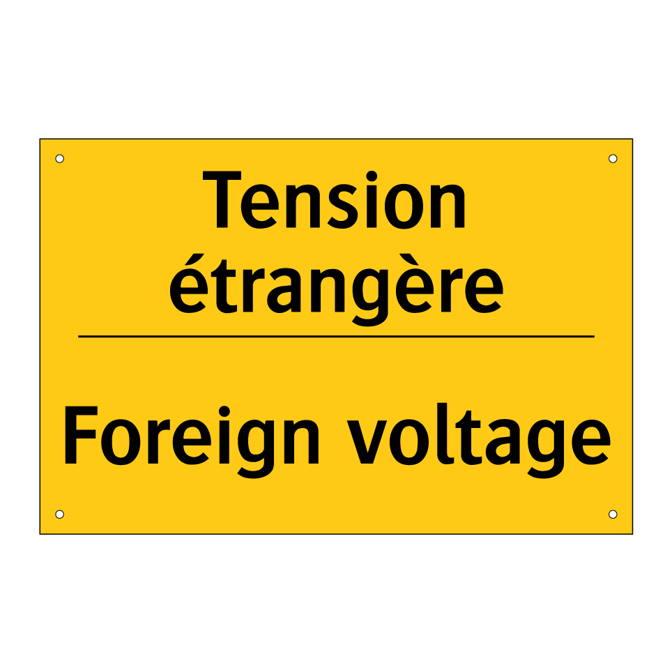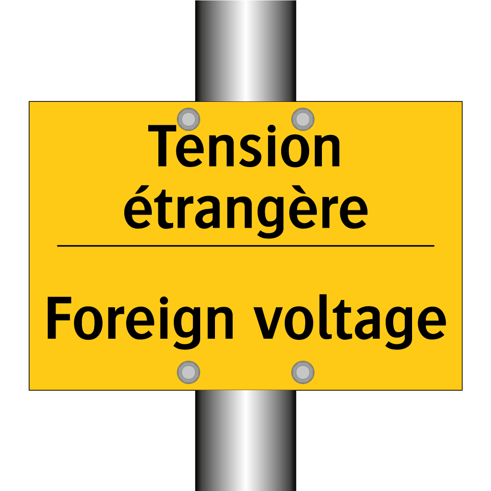 Panneau d'avertissement bilingue avec texte en français : "Tension étrangère", et en anglais : "Foreign voltage"