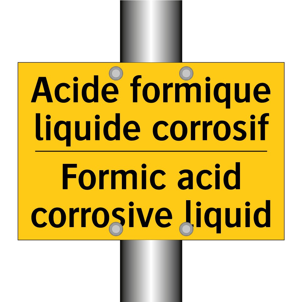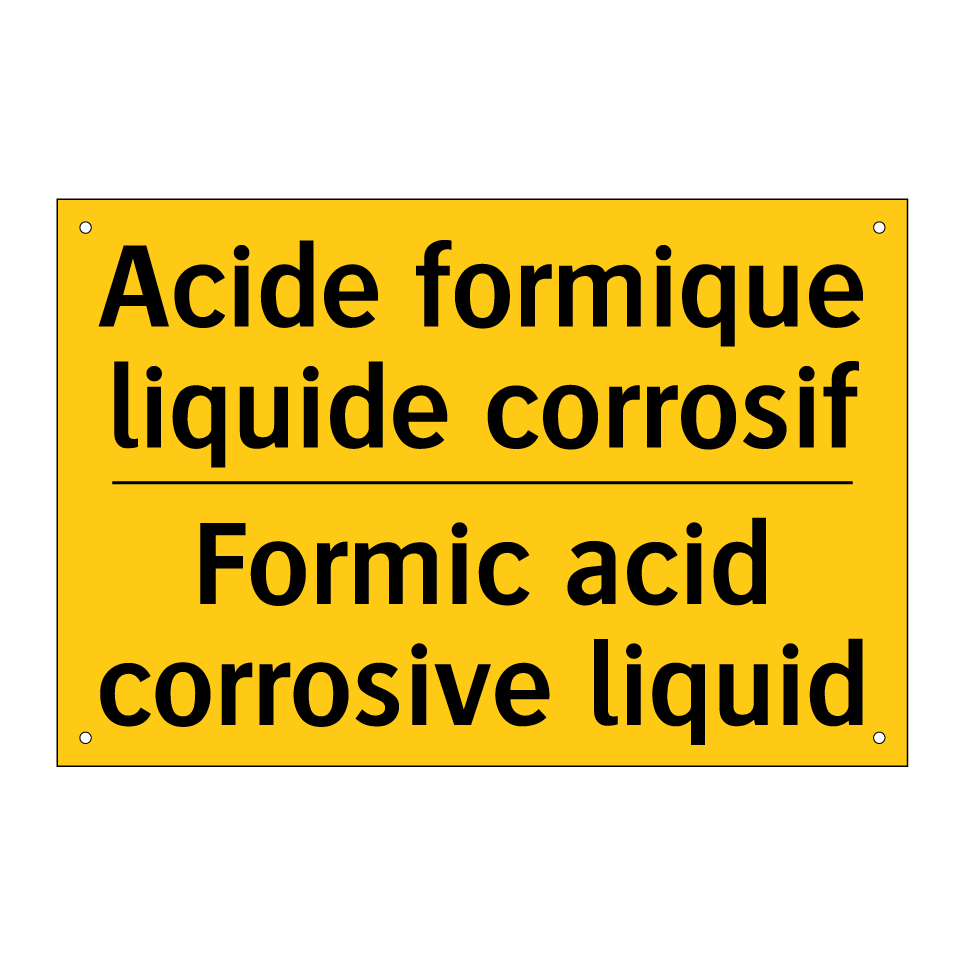 Panneau d'avertissement bilingue avec texte en français : "Acide formique liquide corrosif", et en anglais : "Formic acid corrosive liquid"