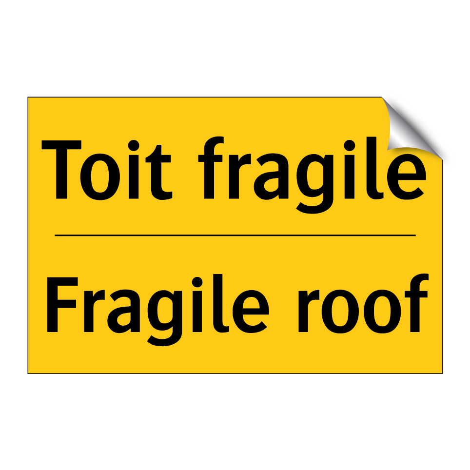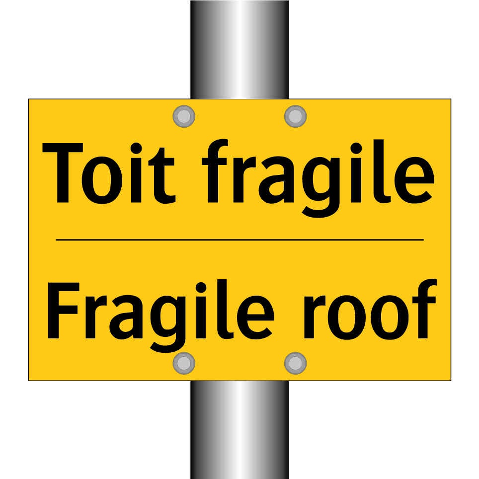 Panneau d'avertissement bilingue avec texte en français : "Toit fragile", et en anglais : "Fragile roof"