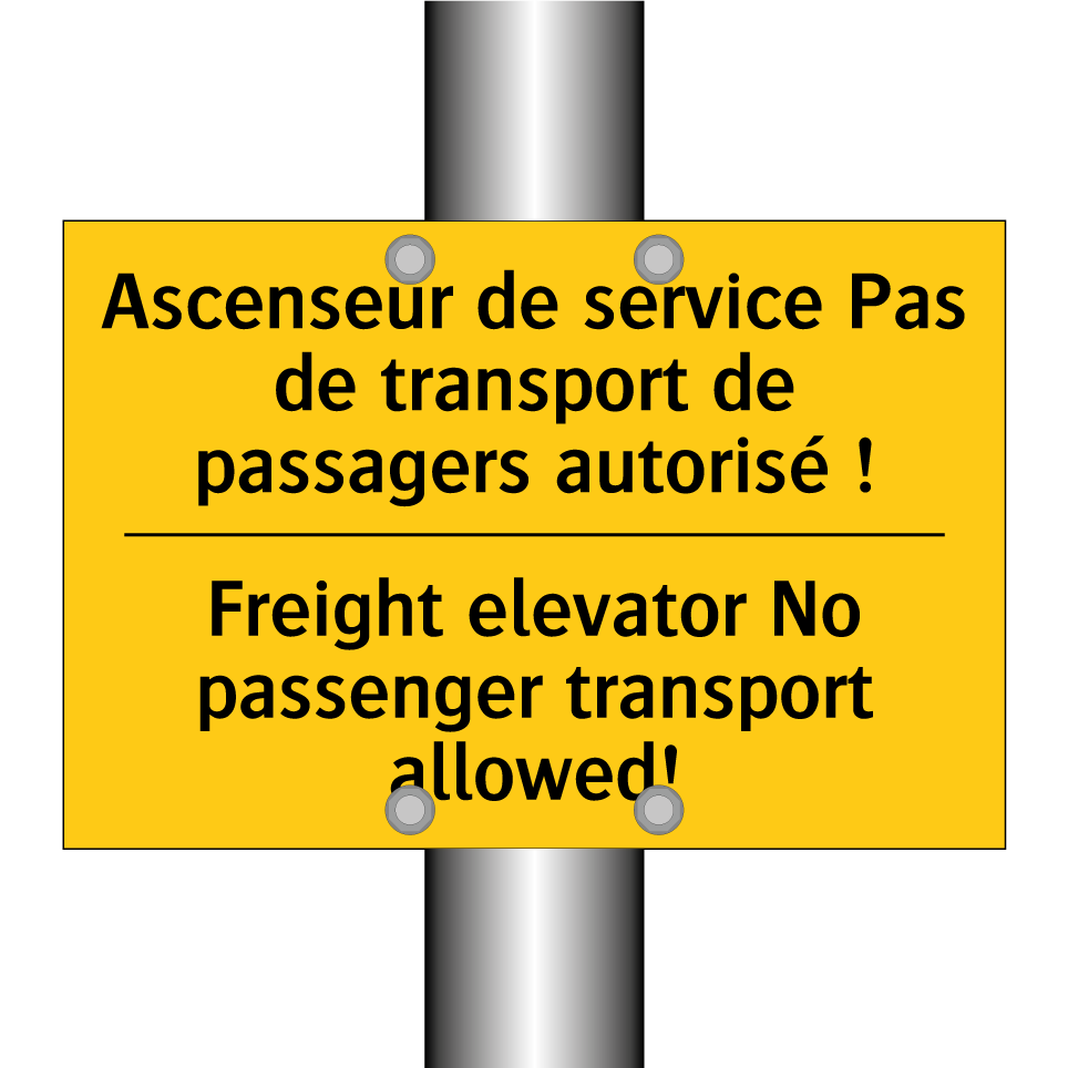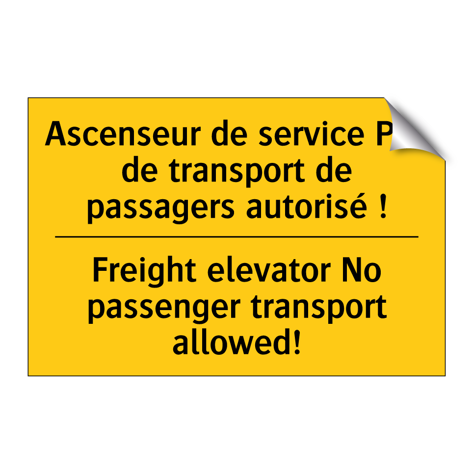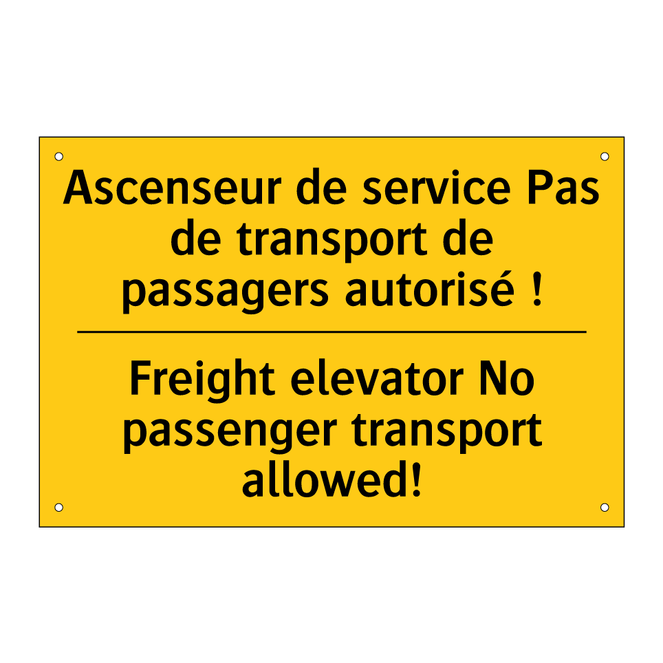 Panneau d'avertissement bilingue avec texte en français : "Ascenseur de service Pas de transport de passagers autorisé !", et en anglais : "Freight elevator No passenger transport allowed!"