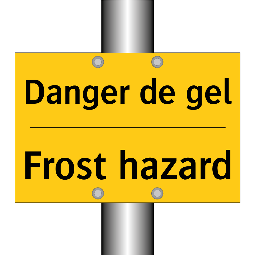 Panneau d'avertissement bilingue avec texte en français : "Danger de gel", et en anglais : "Frost hazard"