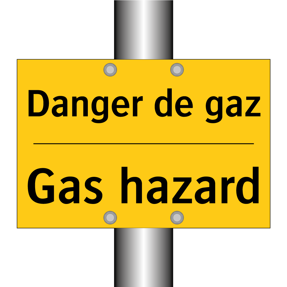 Panneau d'avertissement bilingue avec texte en français : "Danger de gaz", et en anglais : "Gas hazard"