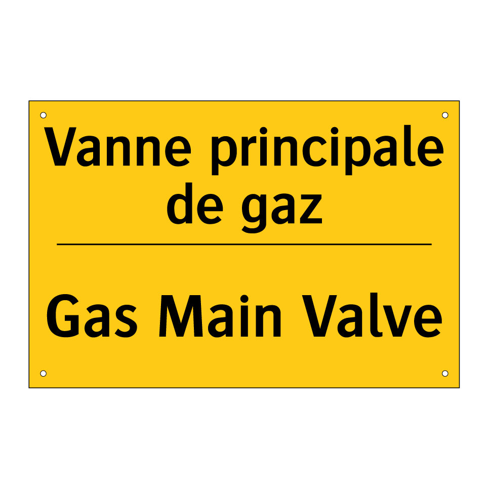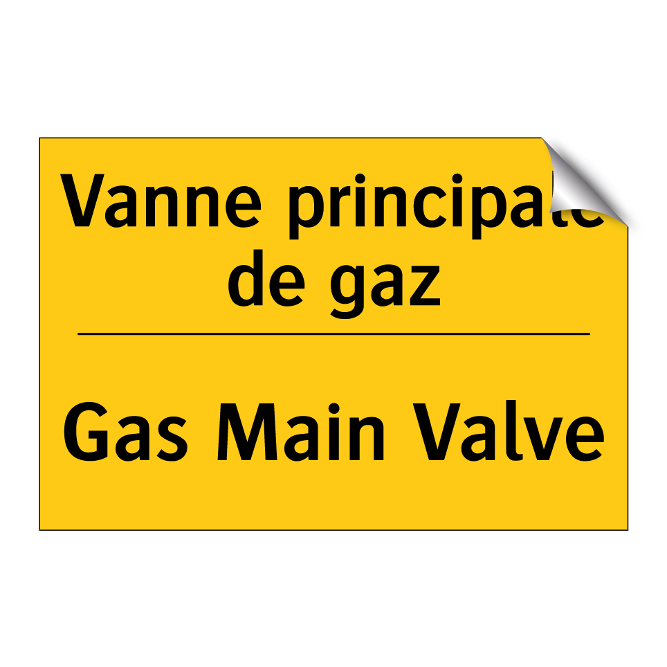 Panneau d'avertissement bilingue avec texte en français : "Vanne principale de gaz", et en anglais : "Gas Main Valve"
