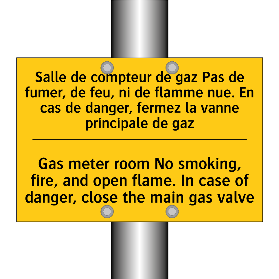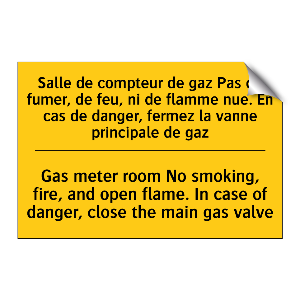 Panneau d'avertissement bilingue avec texte en français : "Salle de compteur de gaz Pas de fumer, de feu, ni de flamme nue. En cas de danger, fermez la vanne principale de gaz", et en anglais : "Gas meter room No smoking, fire, and open flame. In case of danger, close the main gas valve"