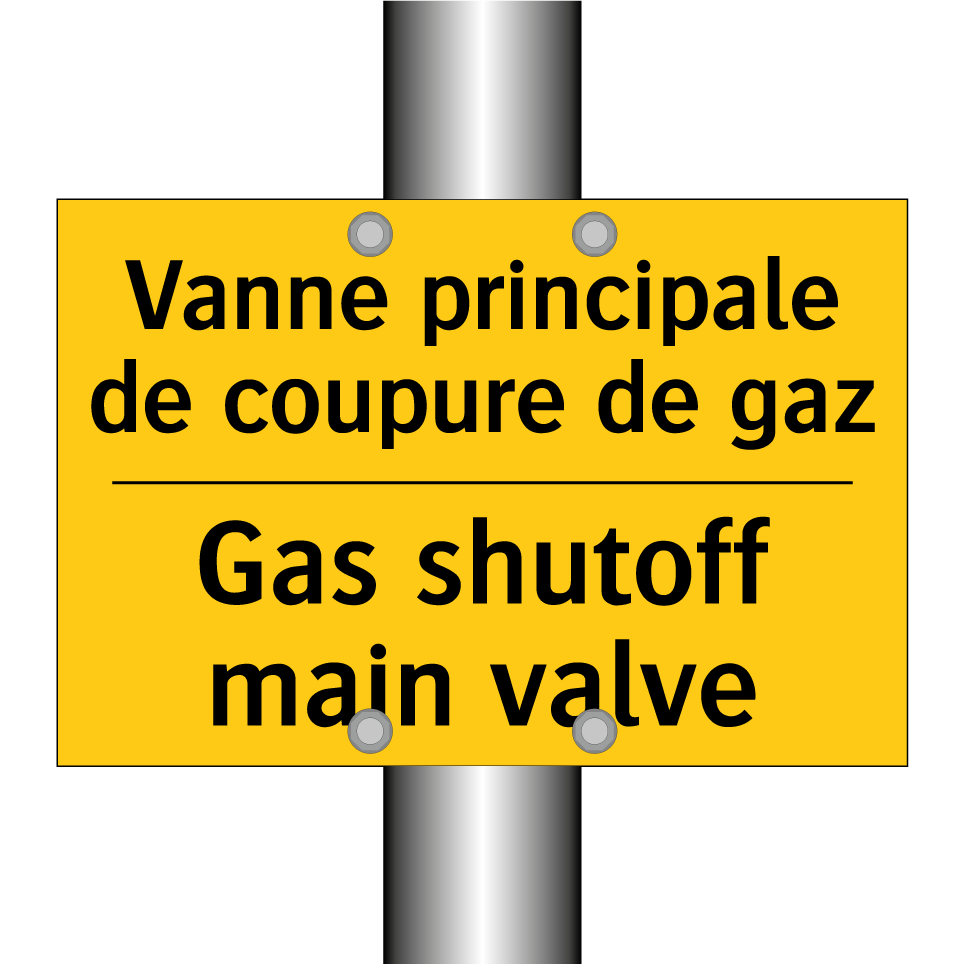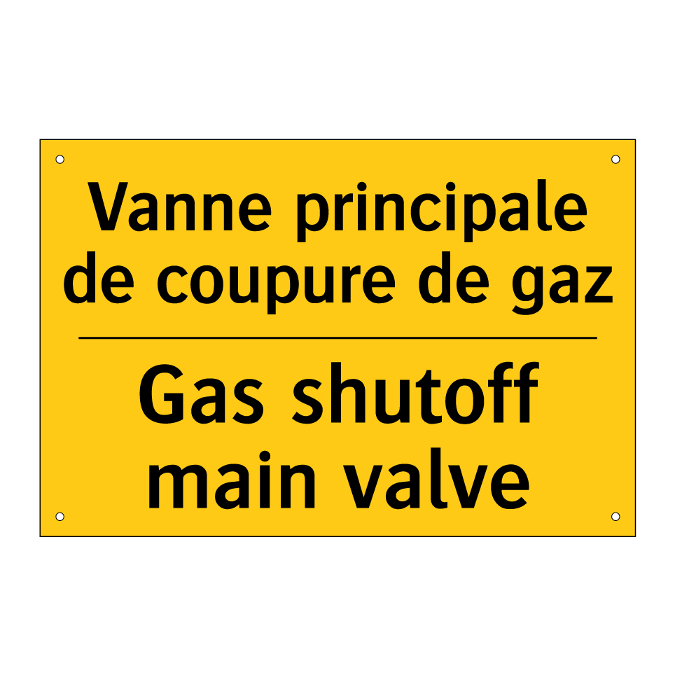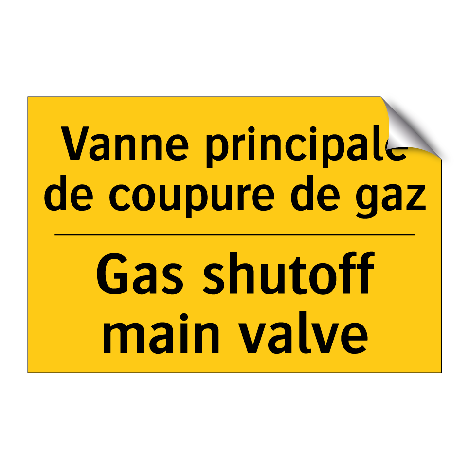 Panneau d'avertissement bilingue avec texte en français : "Vanne principale de coupure de gaz", et en anglais : "Gas shutoff main valve"