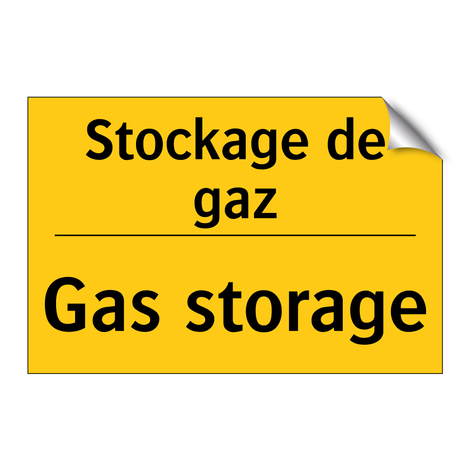 Panneau d'avertissement bilingue avec texte en français : "Stockage de gaz", et en anglais : "Gas storage"
