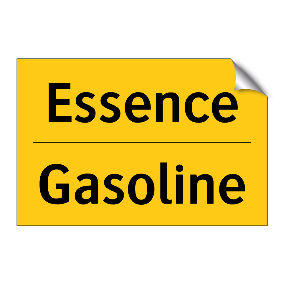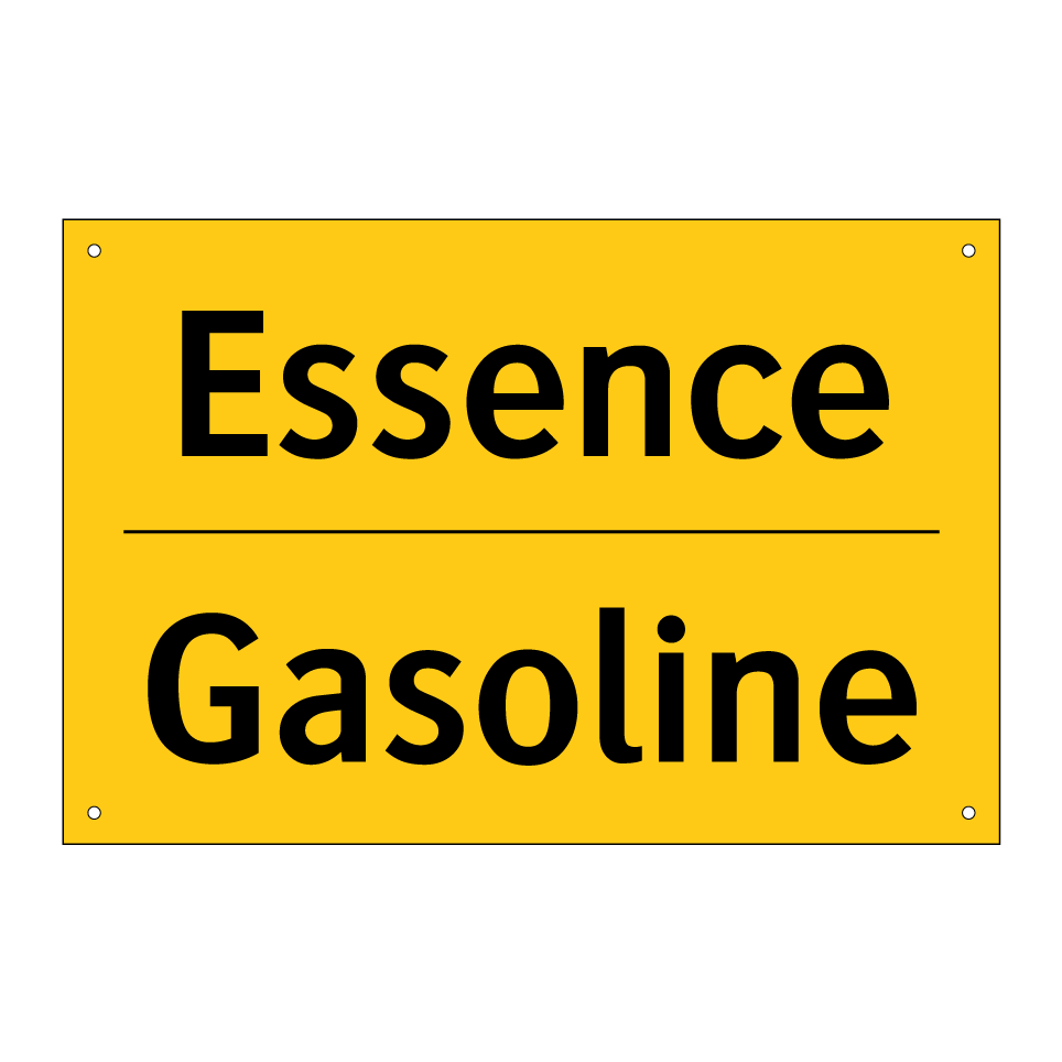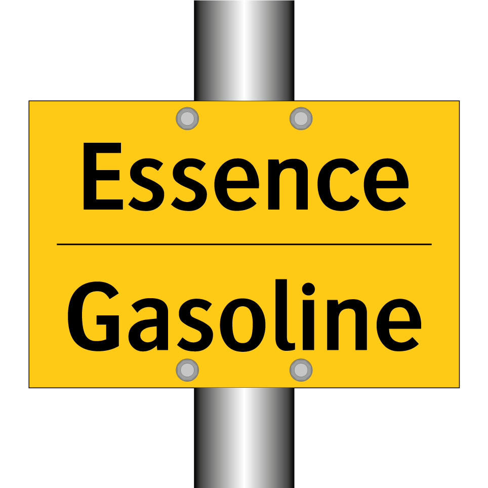 Panneau d'avertissement bilingue avec texte en français : "Essence", et en anglais : "Gasoline"