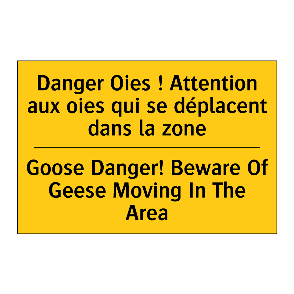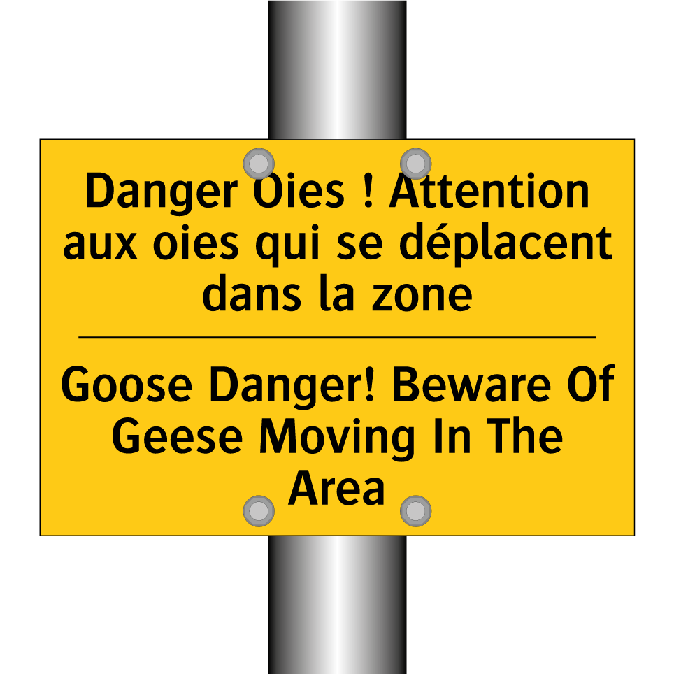Panneau d'avertissement bilingue avec texte en français : "Danger Oies ! Attention aux oies qui se déplacent dans la zone", et en anglais : "Goose Danger! Beware Of Geese Moving In The Area"