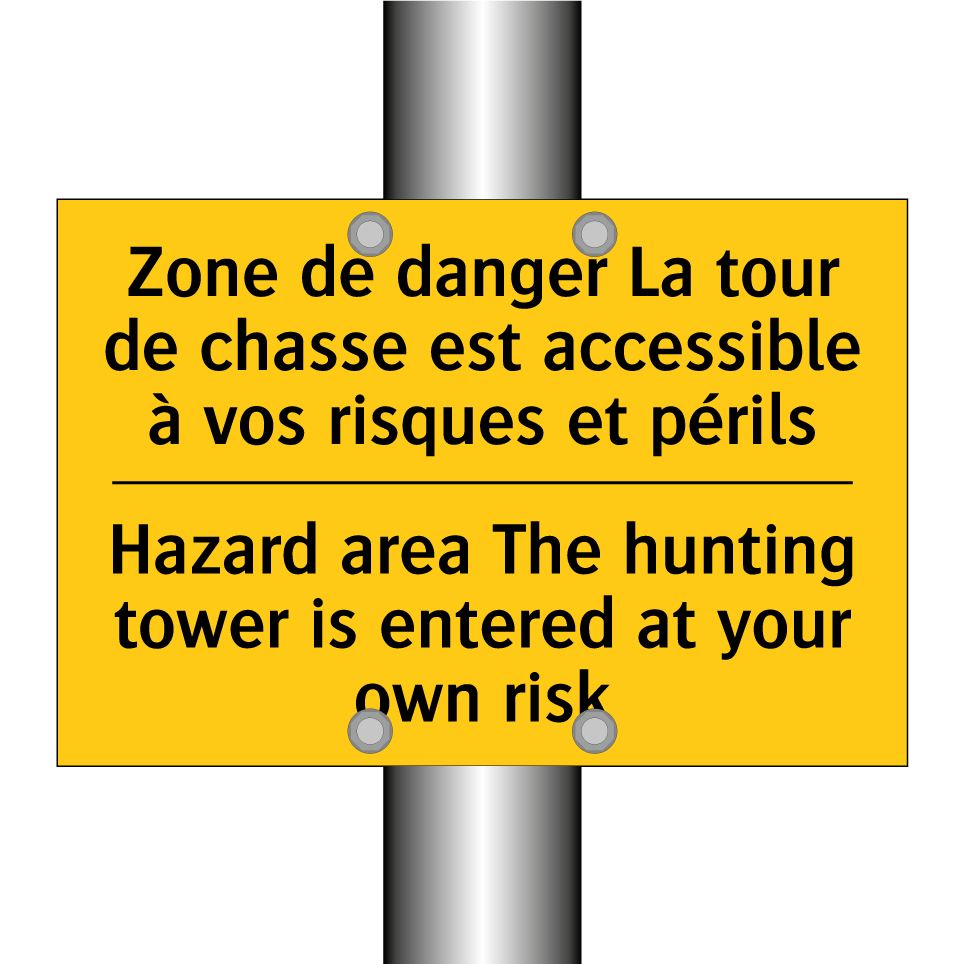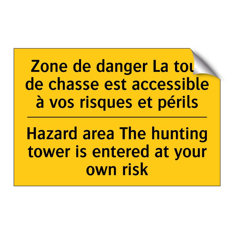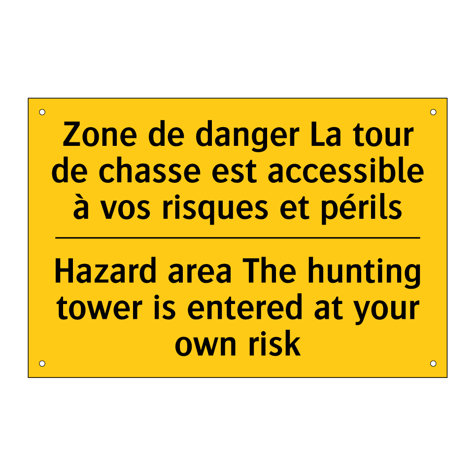 Panneau d'avertissement bilingue avec texte en français : "Zone de danger La tour de chasse est accessible à vos risques et périls", et en anglais : "Hazard area The hunting tower is entered at your own risk"