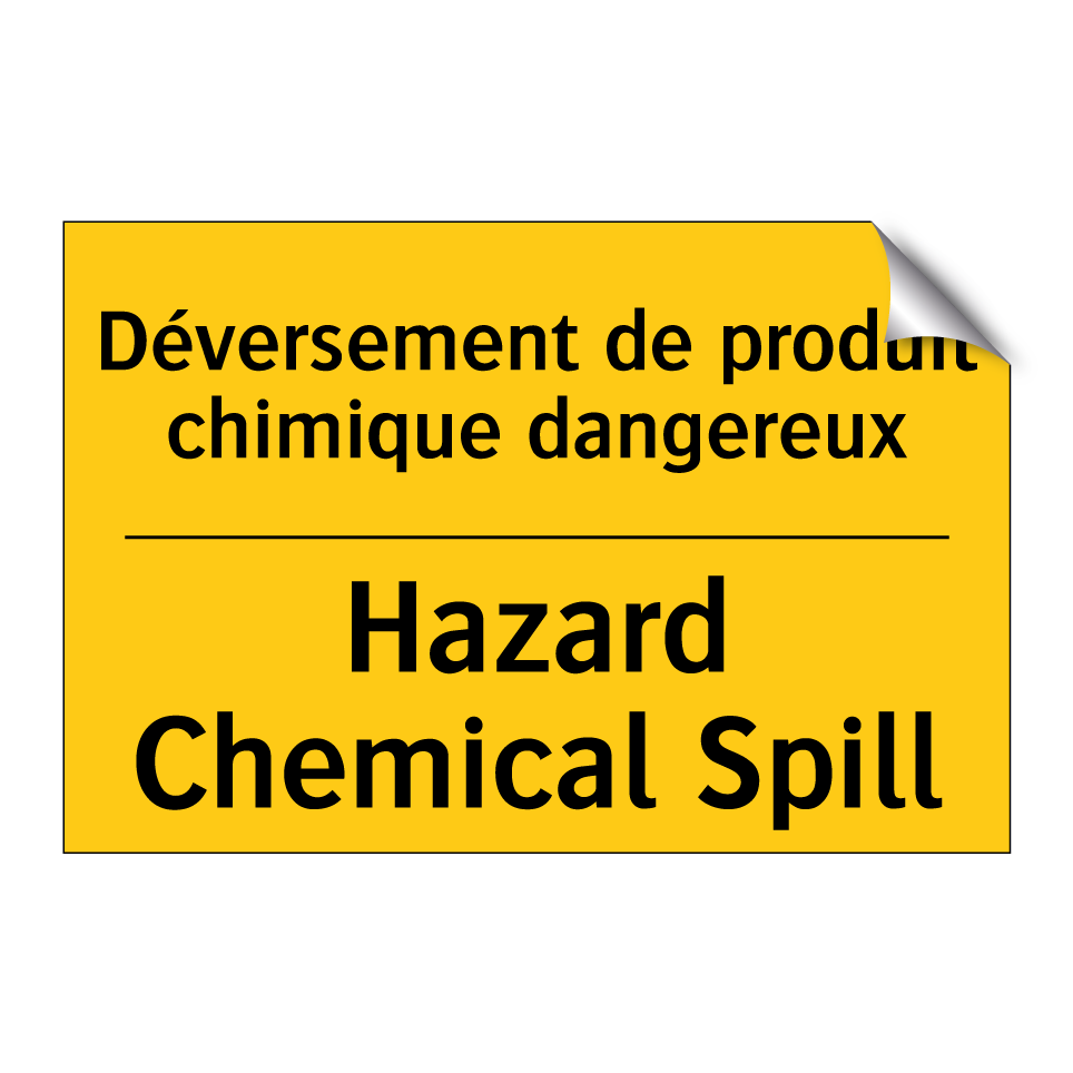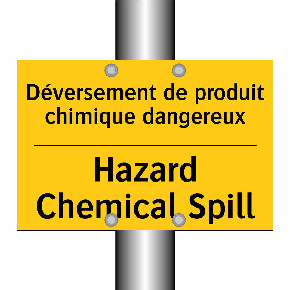Panneau d'avertissement bilingue avec texte en français : "Déversement de produit chimique dangereux", et en anglais : "Hazard Chemical Spill"