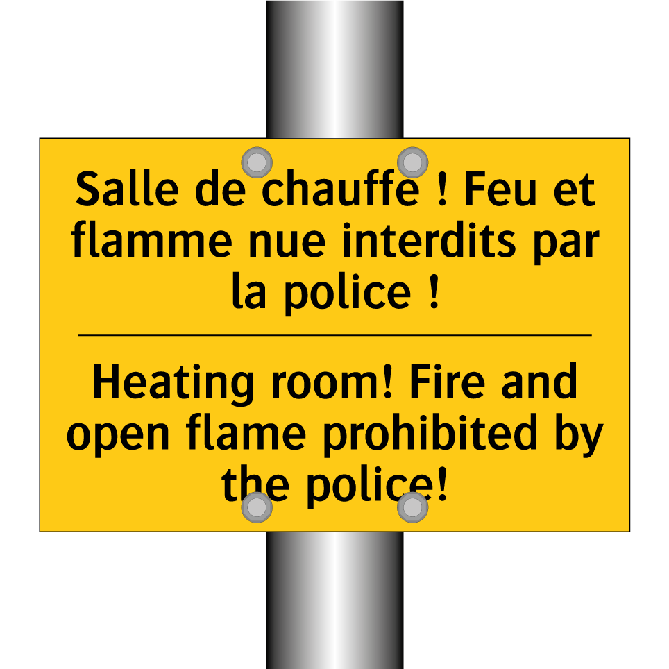 Panneau d'avertissement bilingue avec texte en français : "Salle de chauffe ! Feu et flamme nue interdits par la police !", et en anglais : "Heating room! Fire and open flame prohibited by the police!"