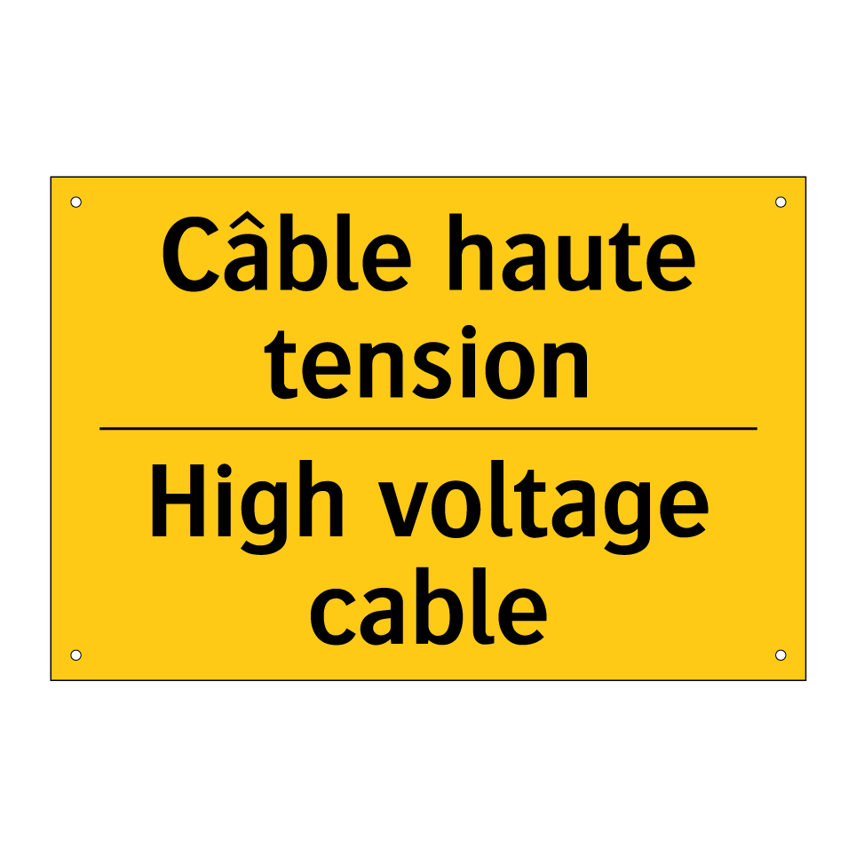 Panneau d'avertissement bilingue avec texte en français : "Câble haute tension", et en anglais : "High voltage cable"