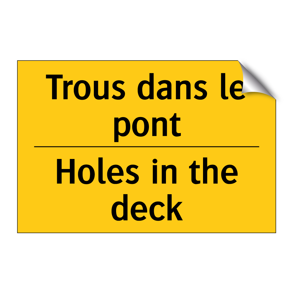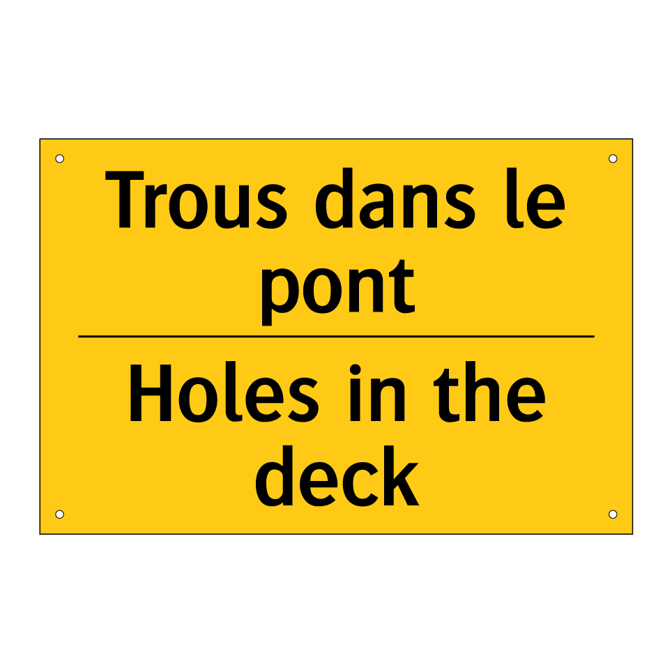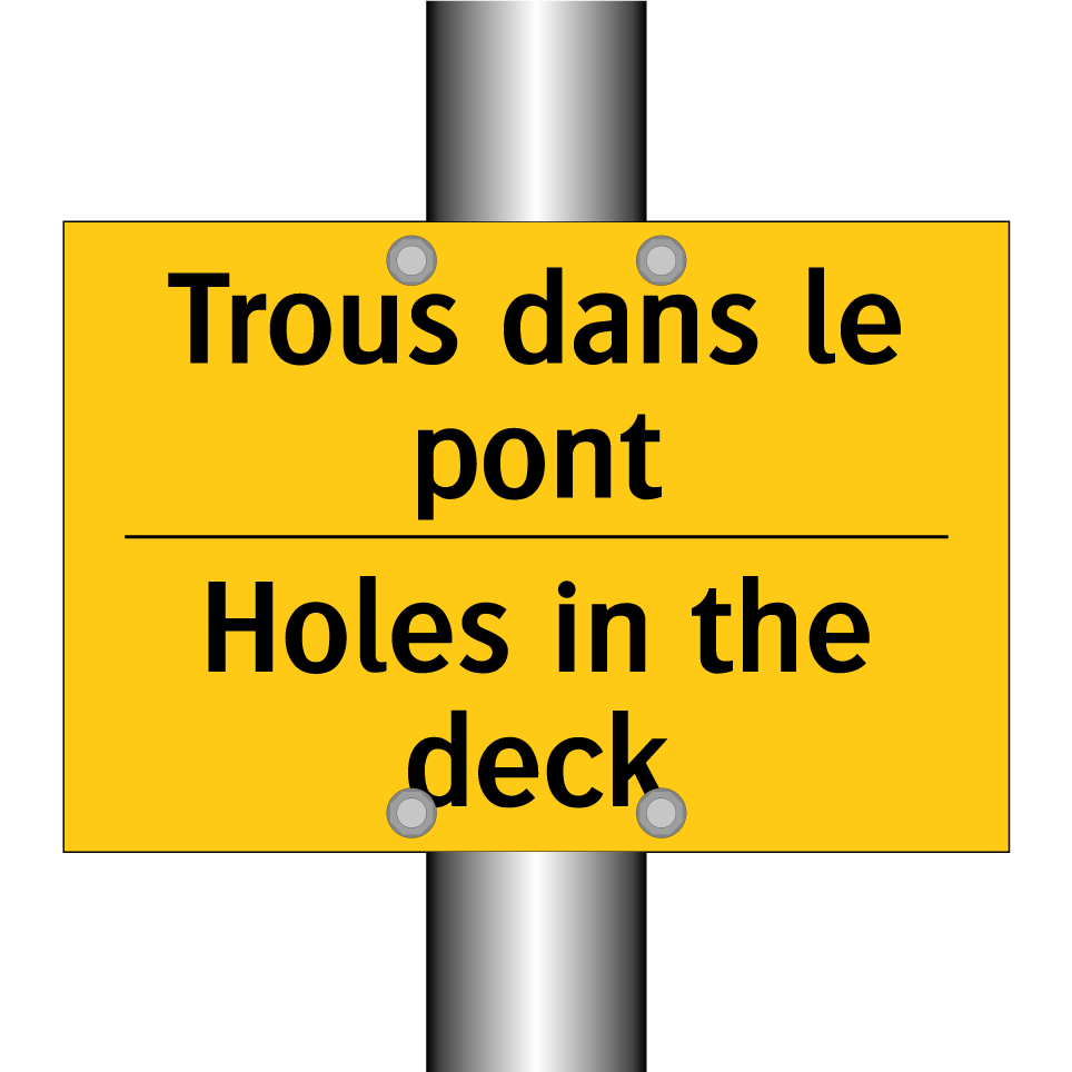 Panneau d'avertissement bilingue avec texte en français : "Trous dans le pont", et en anglais : "Holes in the deck"