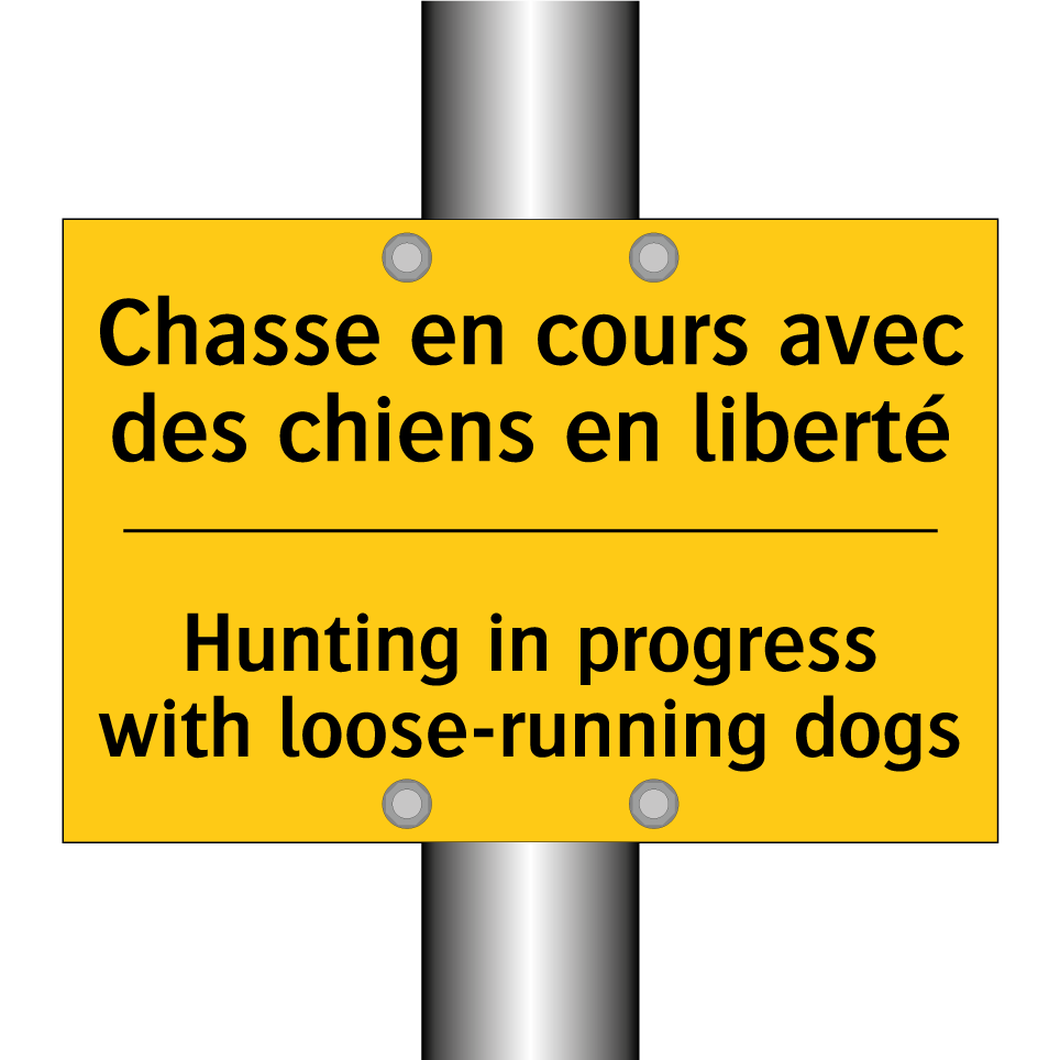 Panneau d'avertissement bilingue avec texte en français : "Chasse en cours avec des chiens en liberté", et en anglais : "Hunting in progress with loose-running dogs"