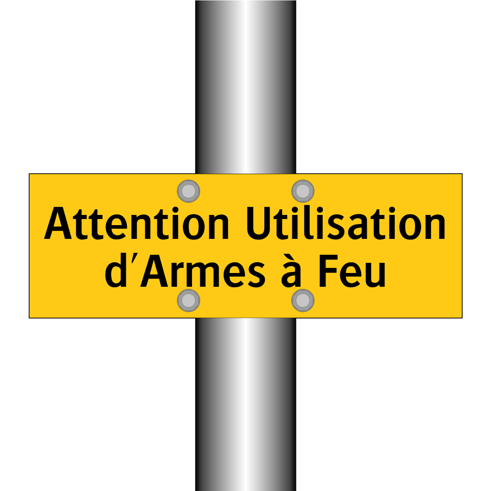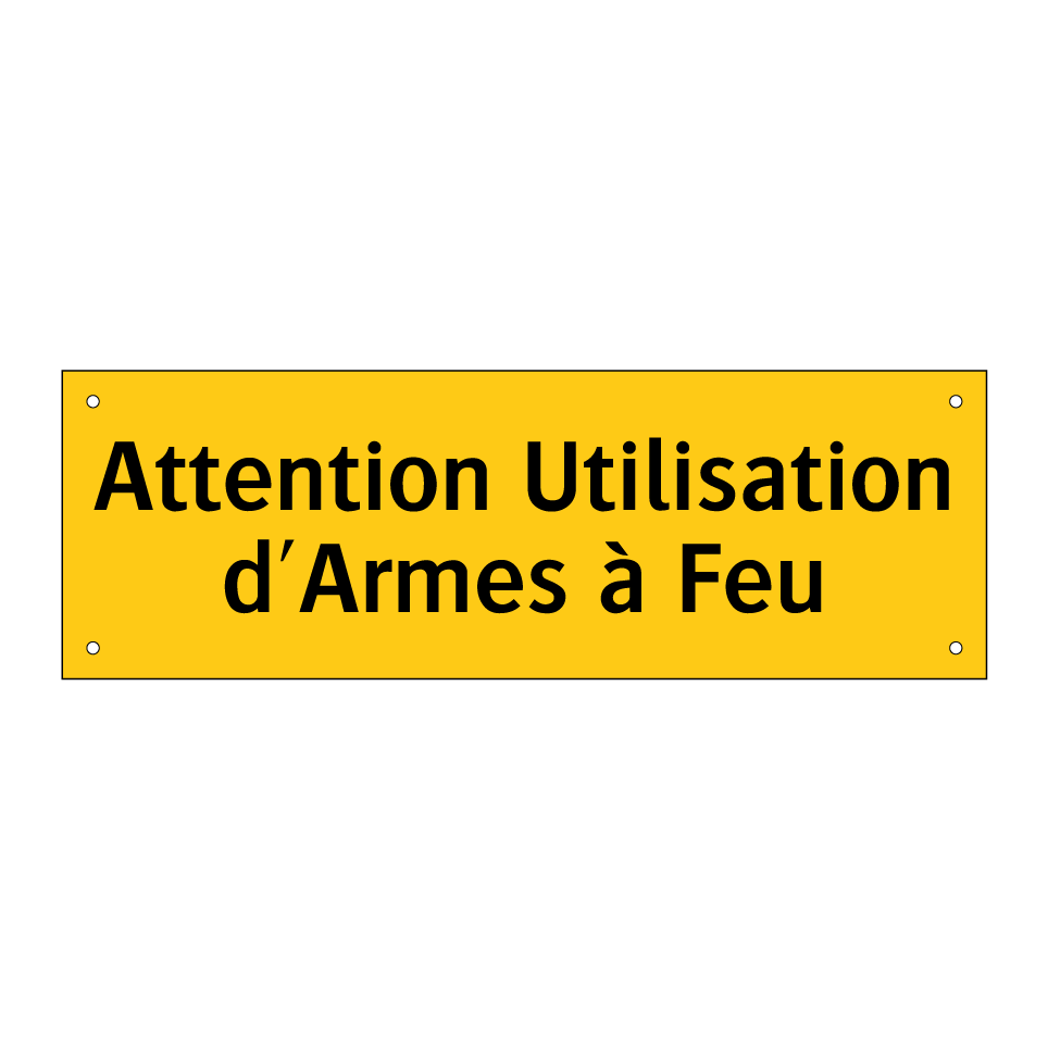 Panneau d'avertissement avec le texte : "Attention Utilisation d'Armes à Feu"