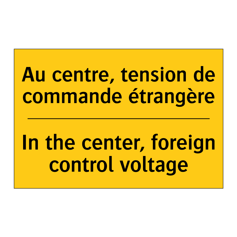 Panneau d'avertissement bilingue avec texte en français : "Au centre, tension de commande étrangère", et en anglais : "In the center, foreign control voltage"