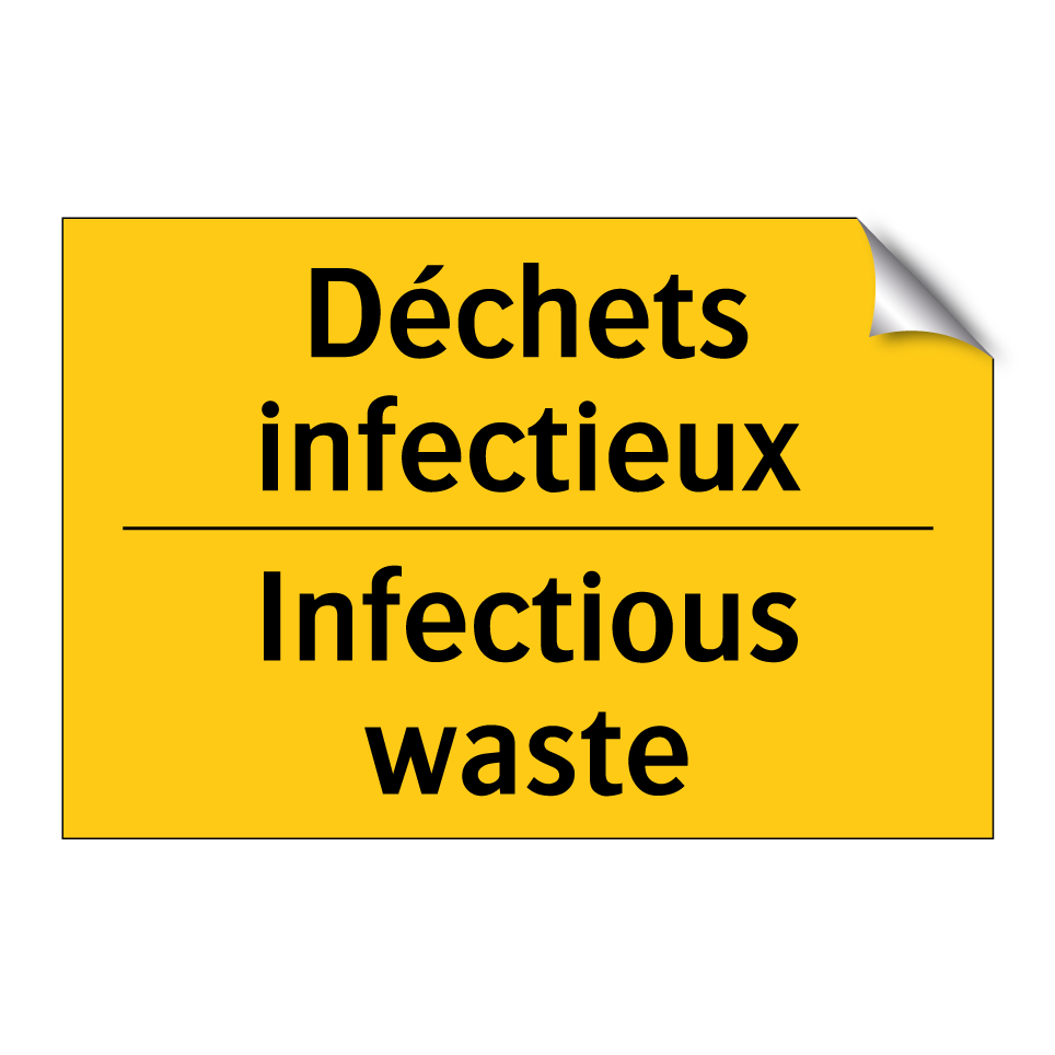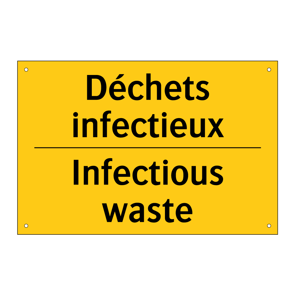 Panneau d'avertissement bilingue avec texte en français : "Déchets infectieux", et en anglais : "Infectious waste"