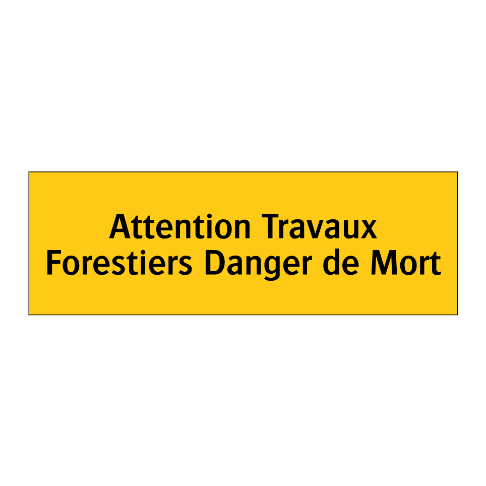 Panneau d'avertissement avec le texte : "Attention Travaux Forestiers Danger de Mort"