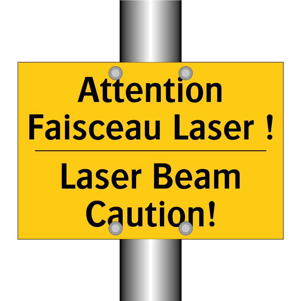 Panneau d'avertissement bilingue avec texte en français : "Attention Faisceau Laser !", et en anglais : "Laser Beam Caution!"