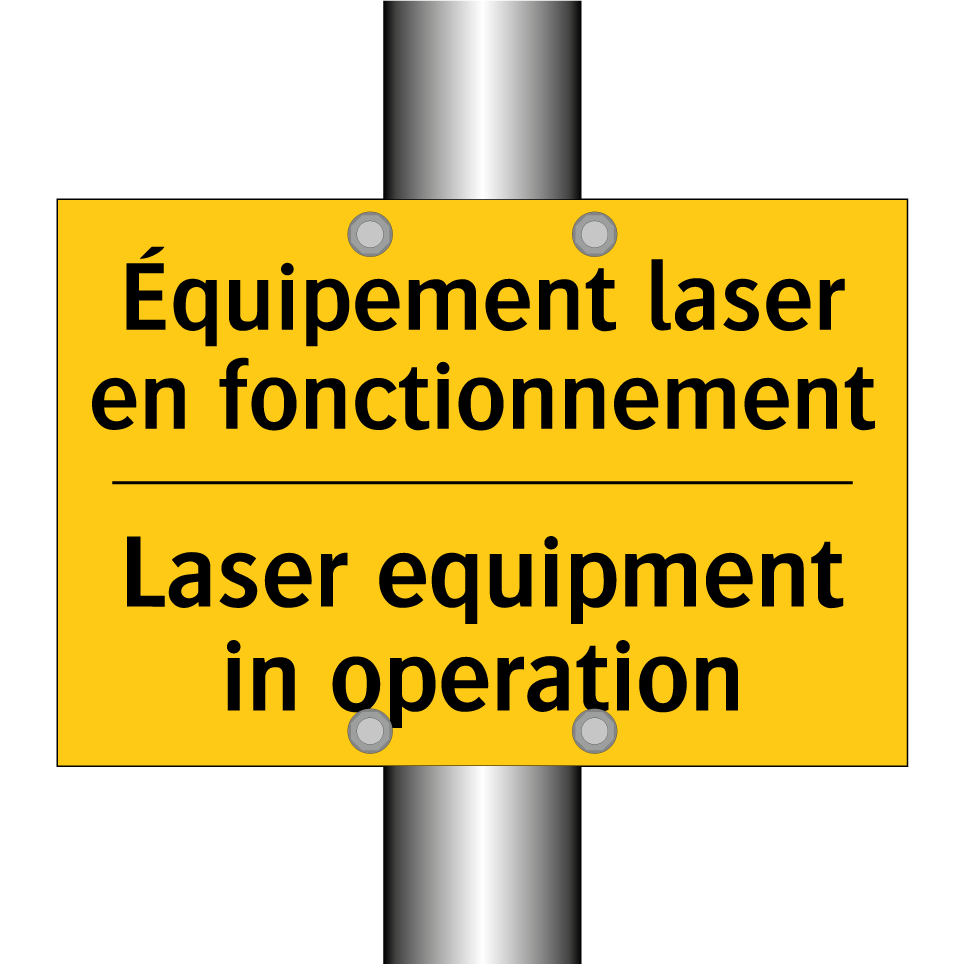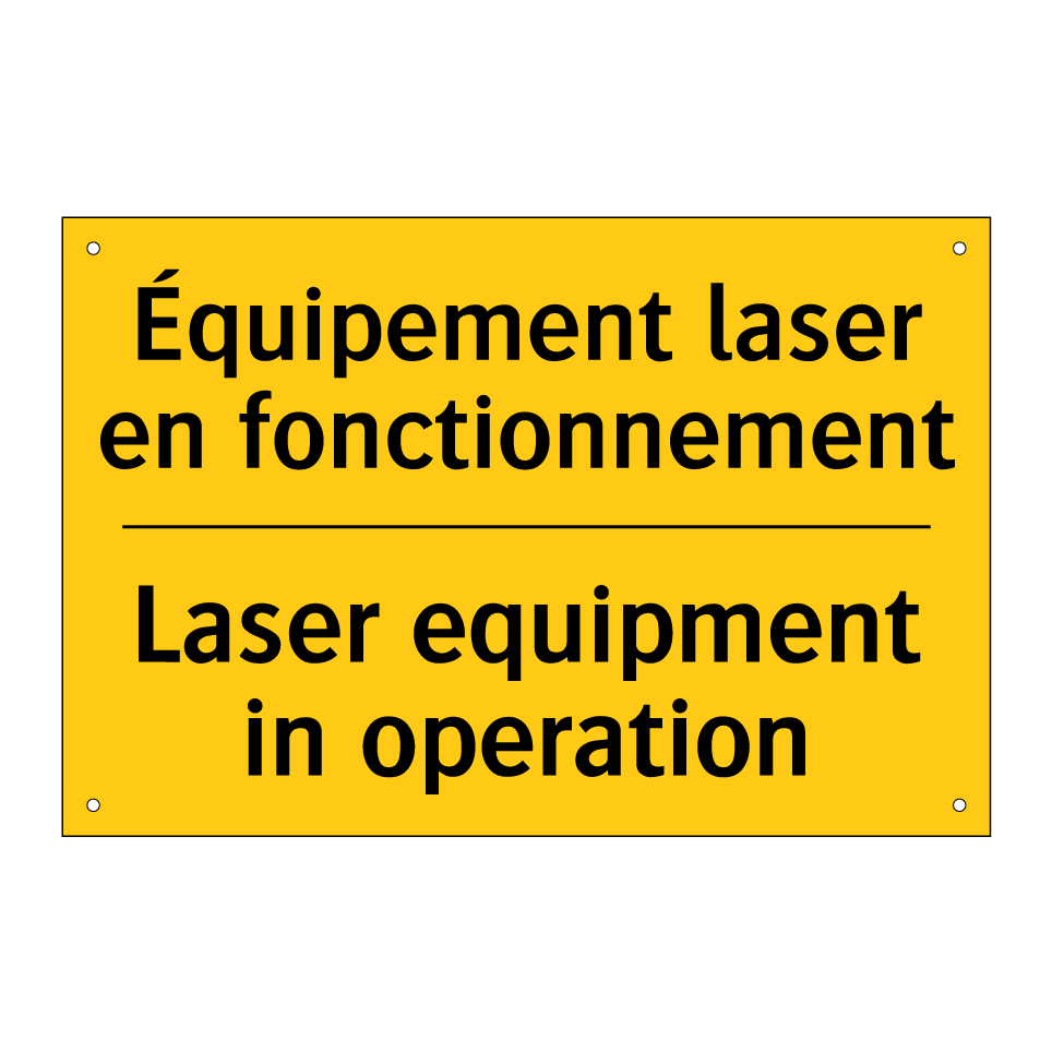 Panneau d'avertissement bilingue avec texte en français : "Équipement laser en fonctionnement", et en anglais : "Laser equipment in operation"