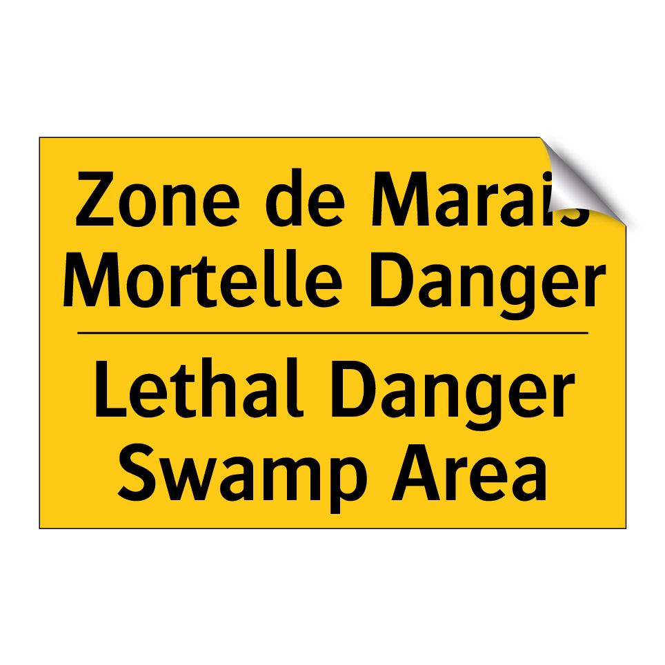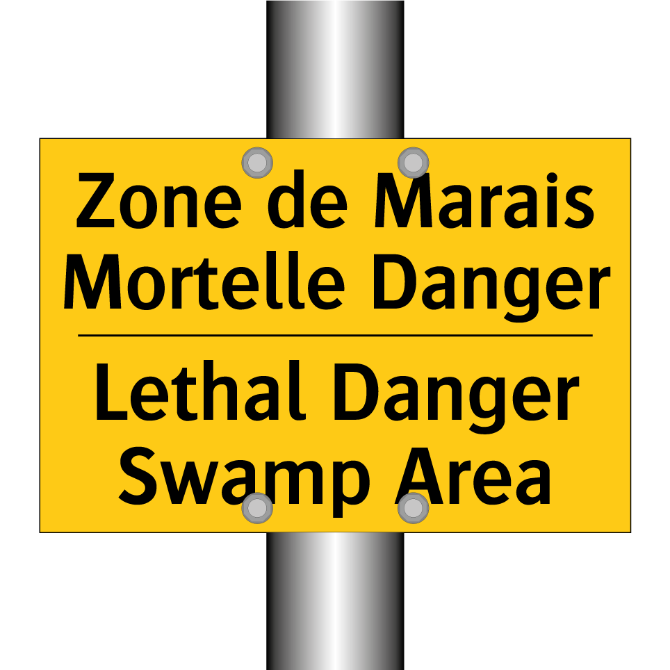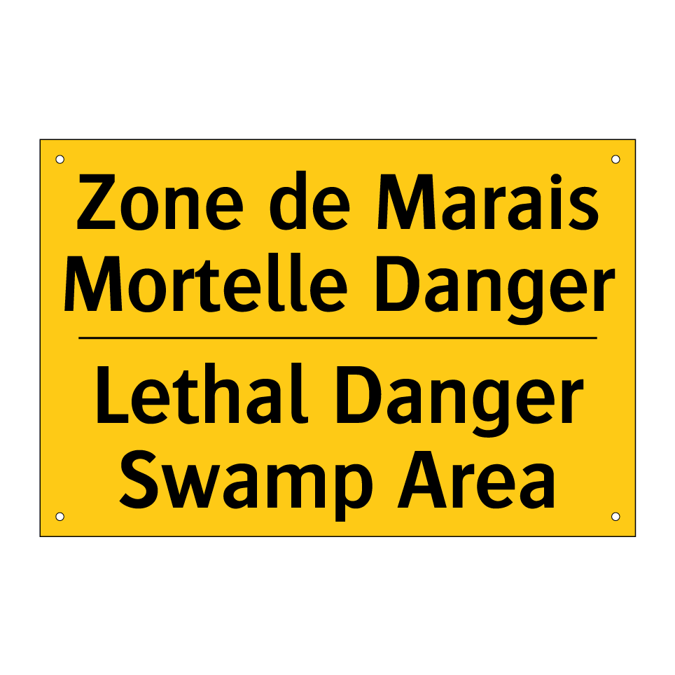 Panneau d'avertissement bilingue avec texte en français : "Zone de Marais Mortelle Danger", et en anglais : "Lethal Danger Swamp Area"