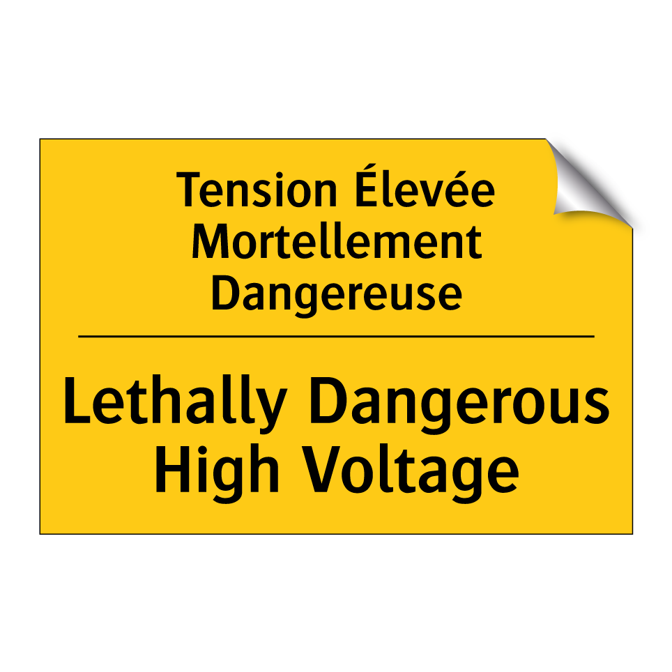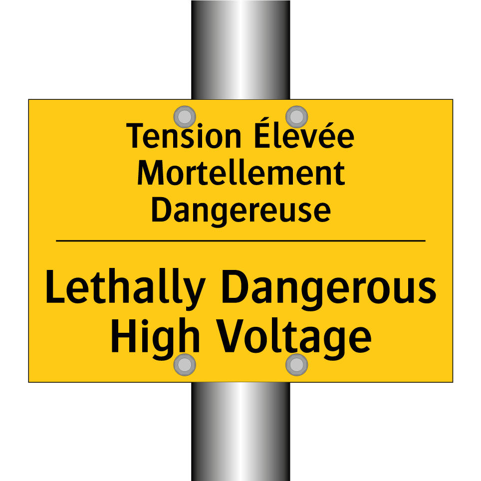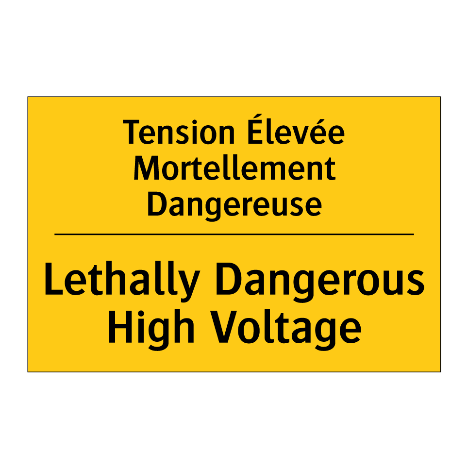 Panneau d'avertissement bilingue avec texte en français : "Tension Élevée Mortellement Dangereuse", et en anglais : "Lethally Dangerous High Voltage"