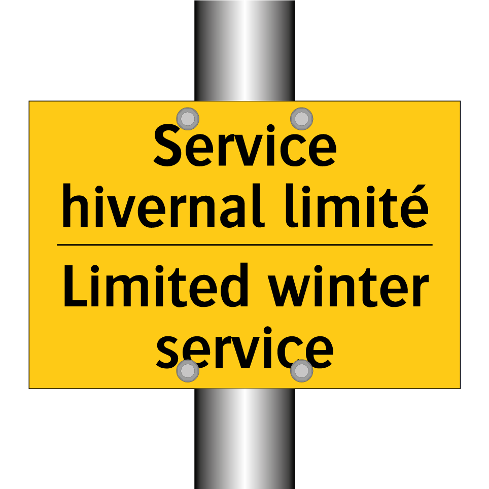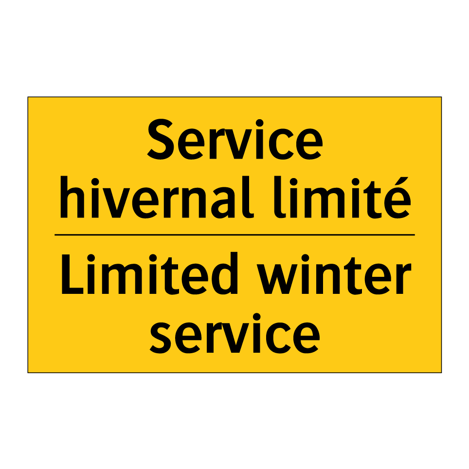 Panneau d'avertissement bilingue avec texte en français : "Service hivernal limité", et en anglais : "Limited winter service"