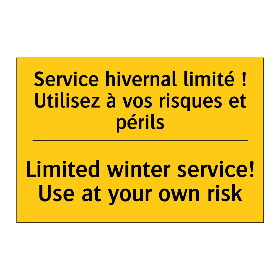 Panneau d'avertissement bilingue avec texte en français : "Service hivernal limité ! Utilisez à vos risques et périls", et en anglais : "Limited winter service! Use at your own risk"
