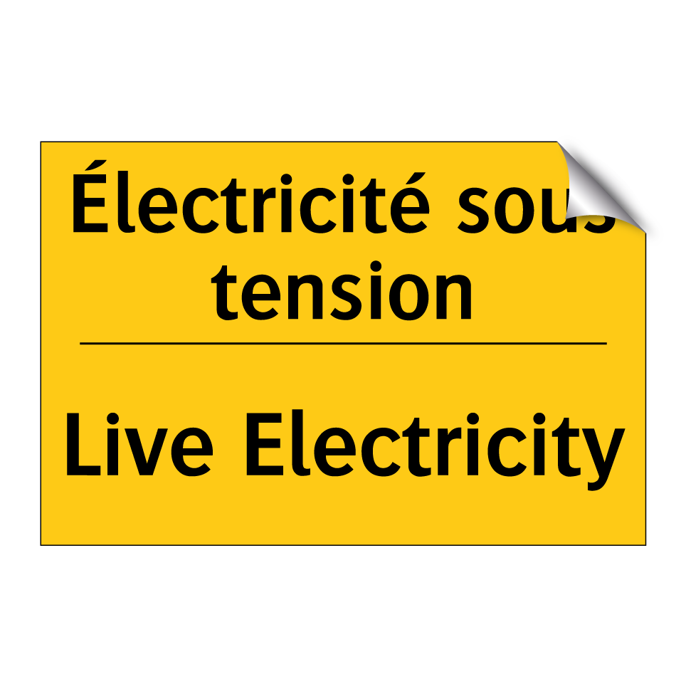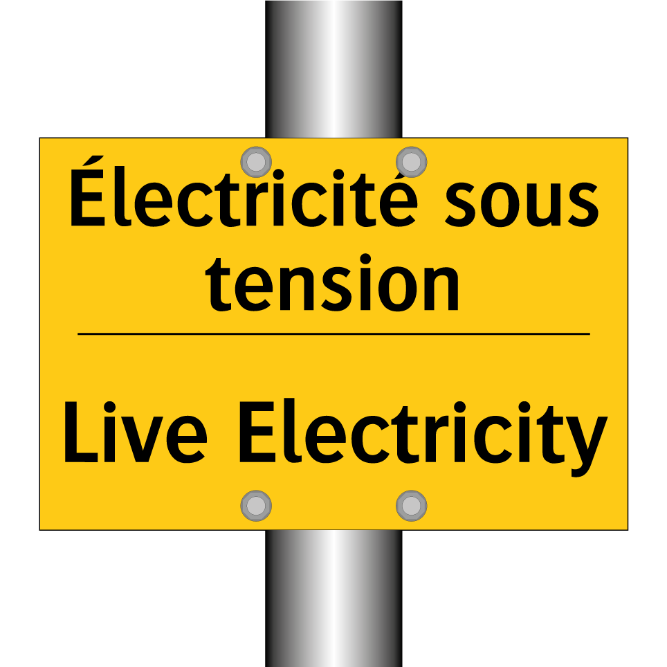Panneau d'avertissement bilingue avec texte en français : "Électricité sous tension", et en anglais : "Live Electricity"