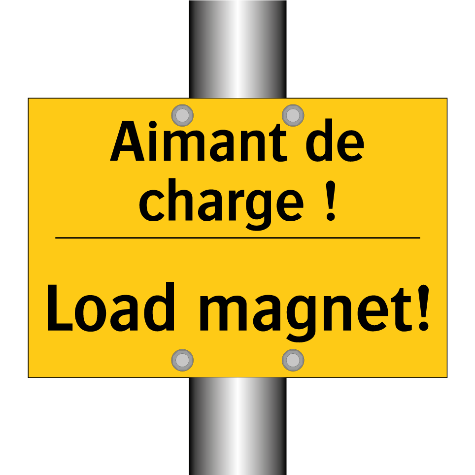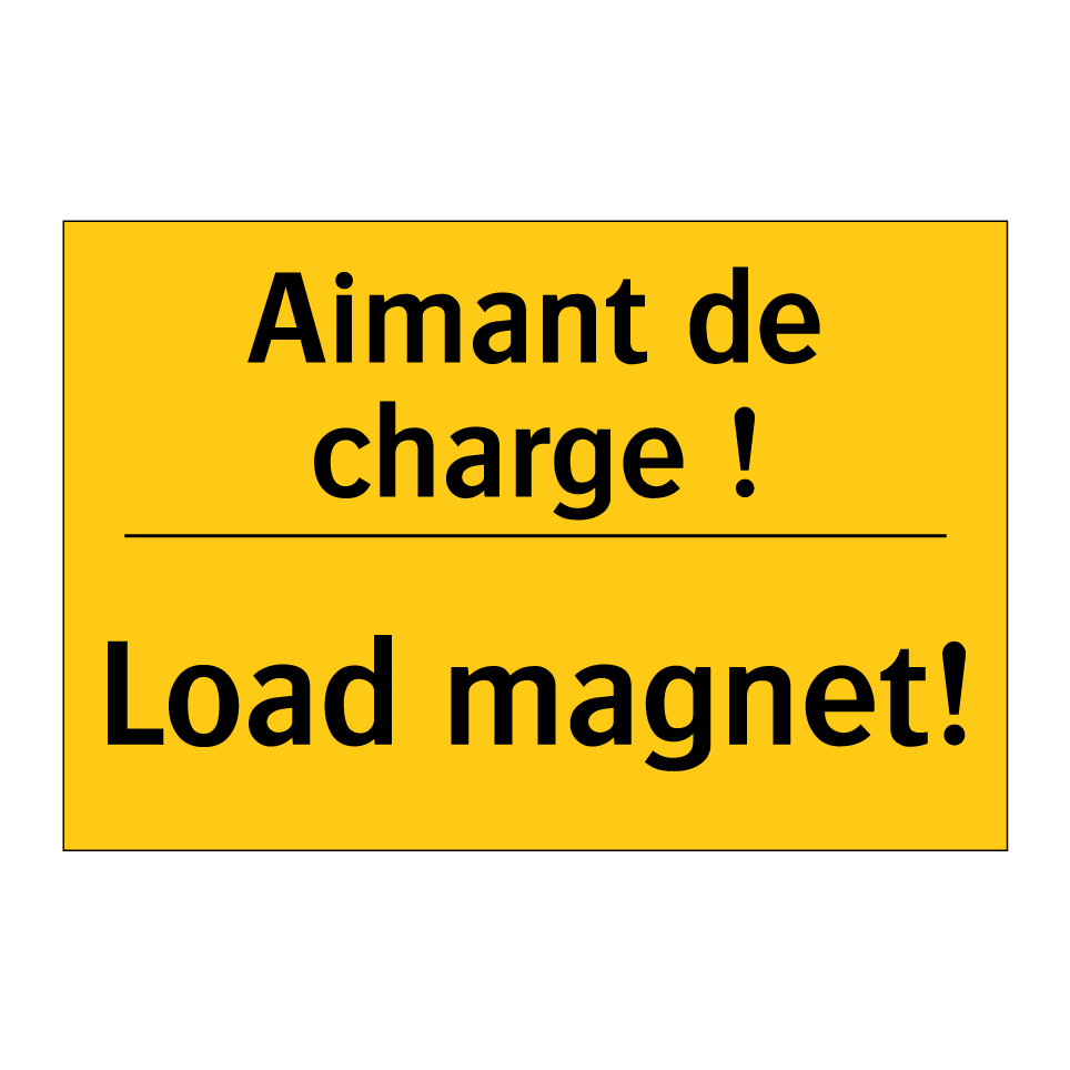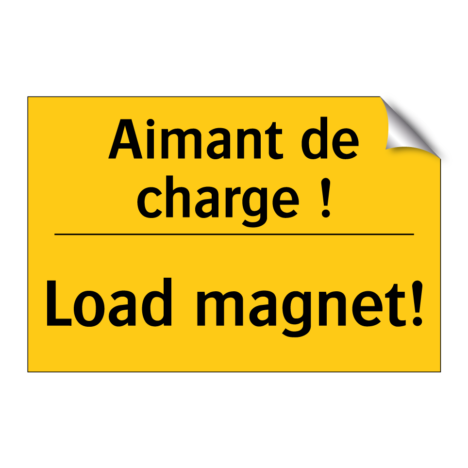 Panneau d'avertissement bilingue avec texte en français : "Aimant de charge !", et en anglais : "Load magnet!"