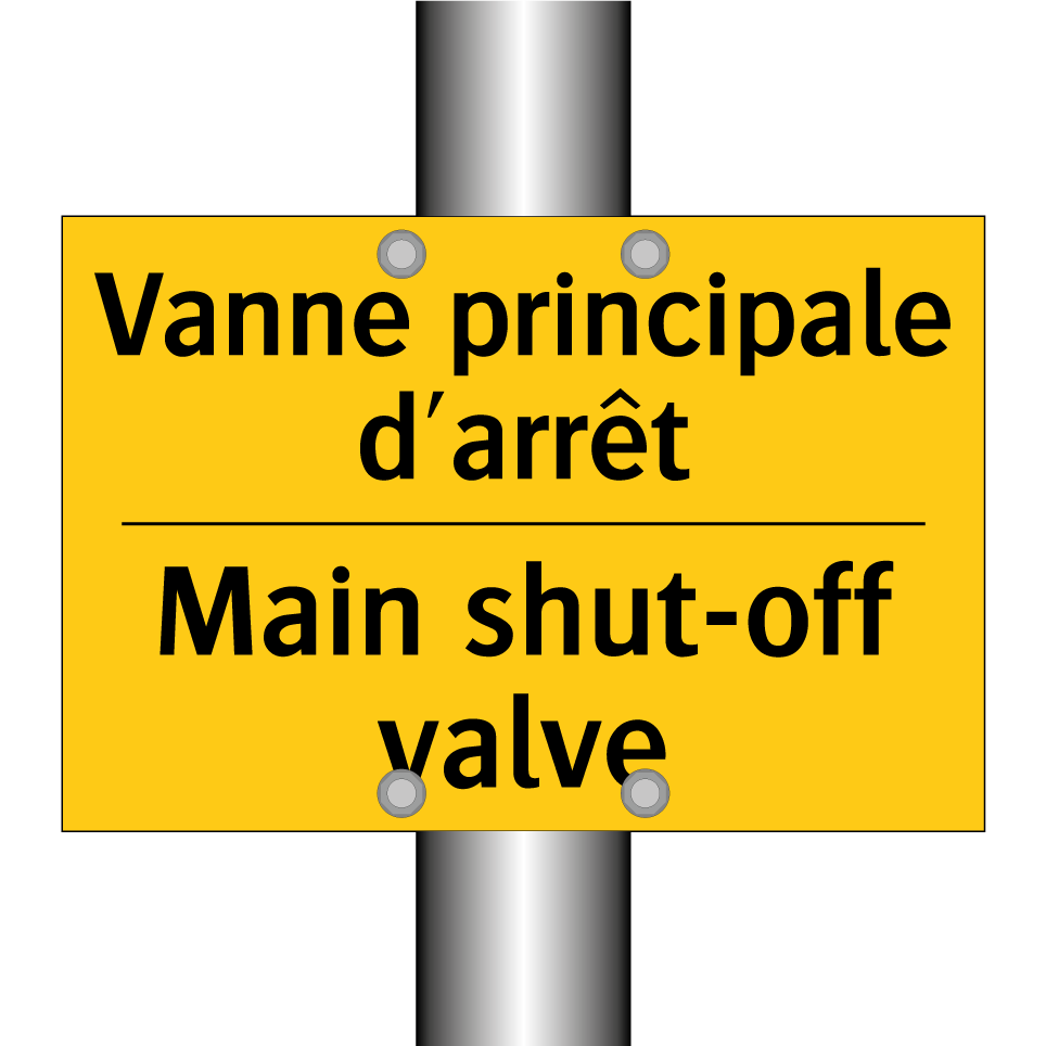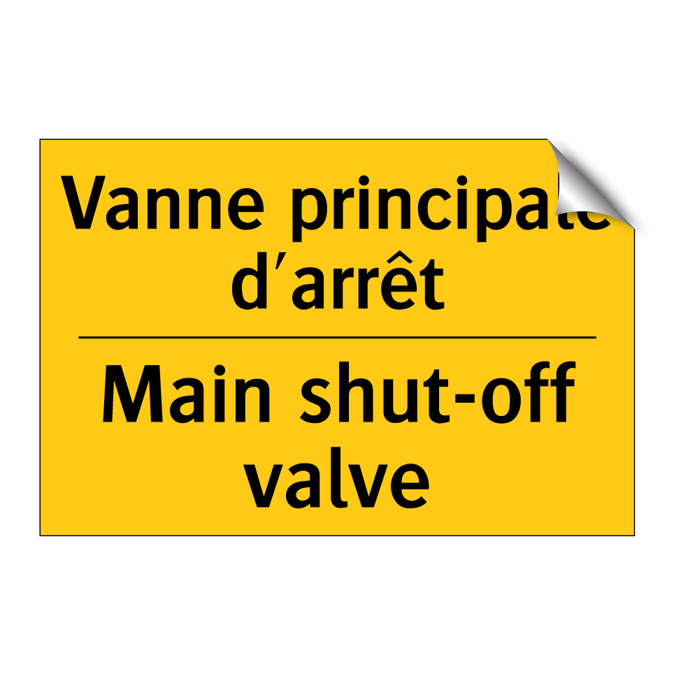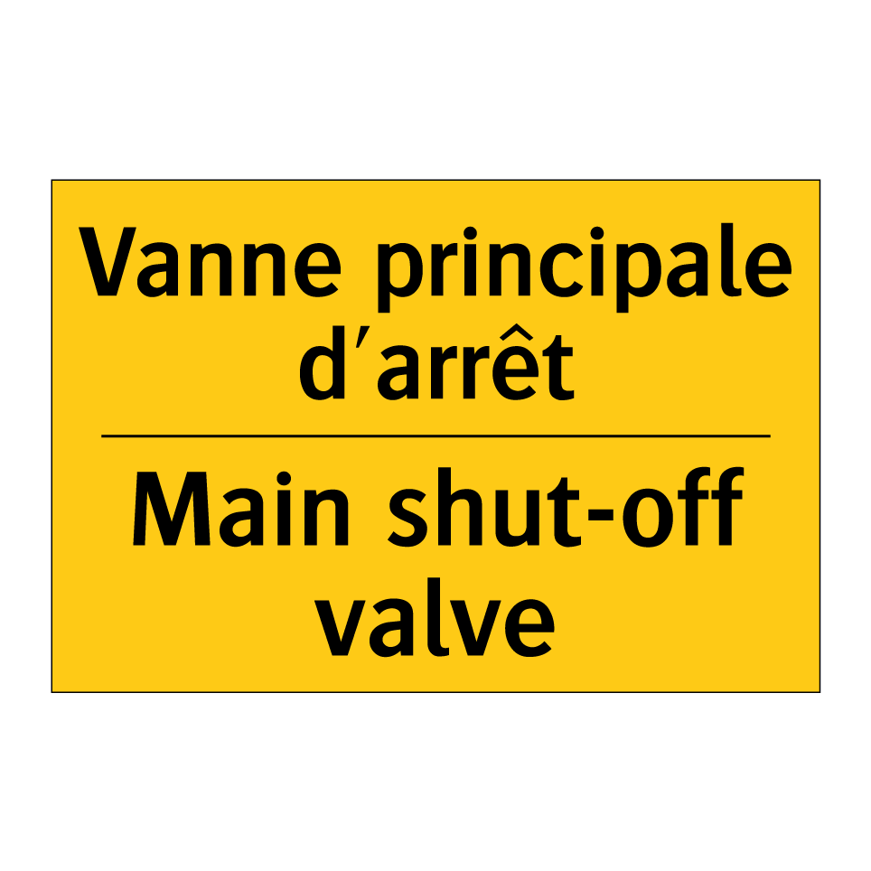 Panneau d'avertissement bilingue avec texte en français : "Vanne principale d'arrêt", et en anglais : "Main shut-off valve"