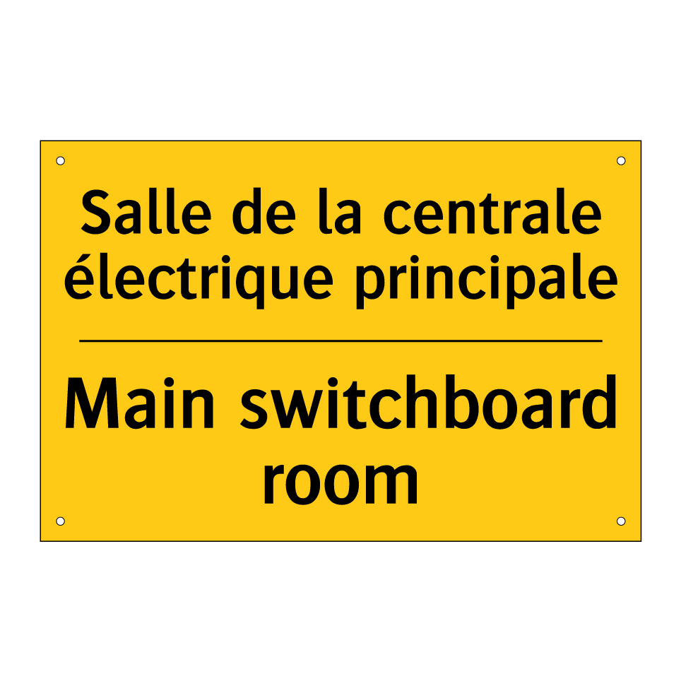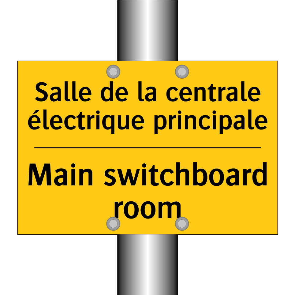 Panneau d'avertissement bilingue avec texte en français : "Salle de la centrale électrique principale", et en anglais : "Main switchboard room"