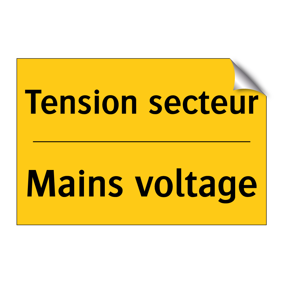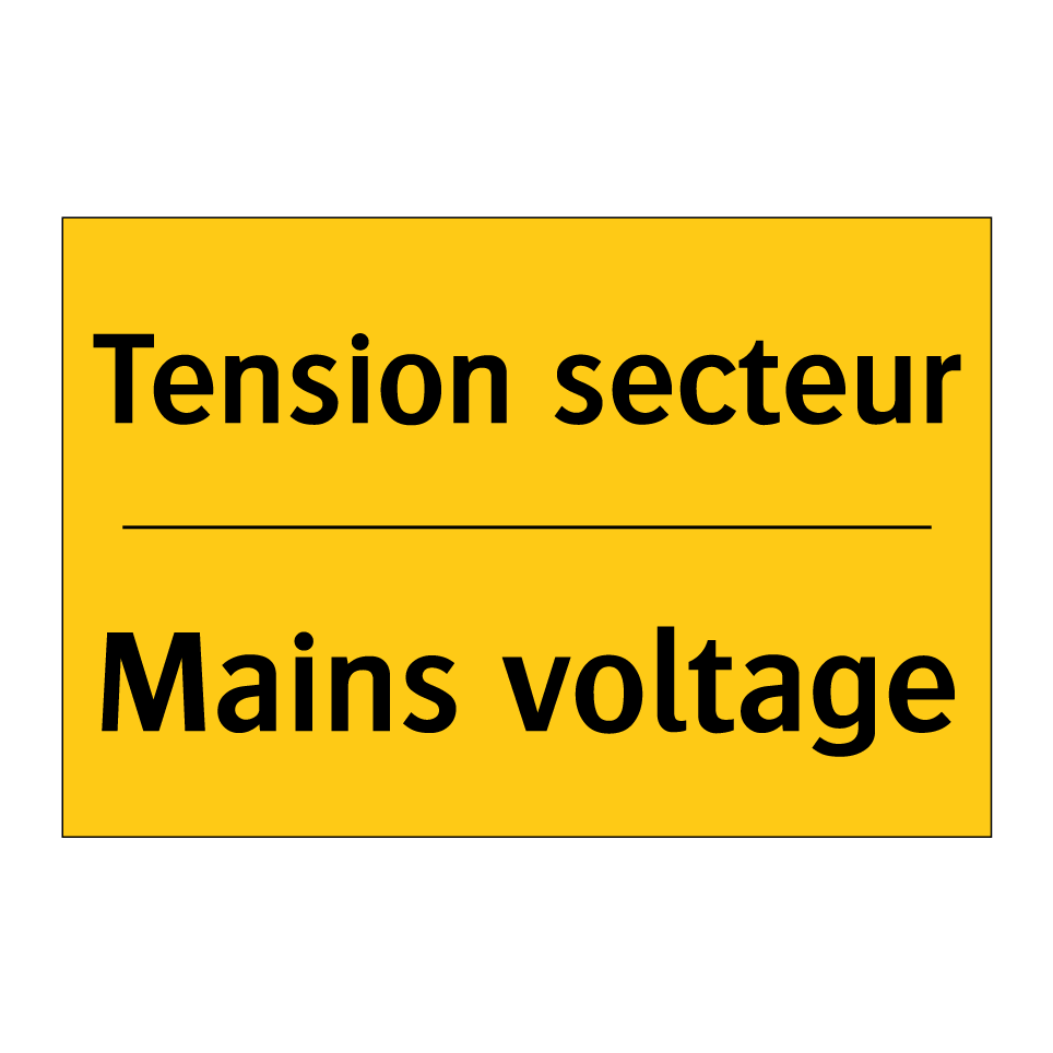 Panneau d'avertissement bilingue avec texte en français : "Tension secteur", et en anglais : "Mains voltage"