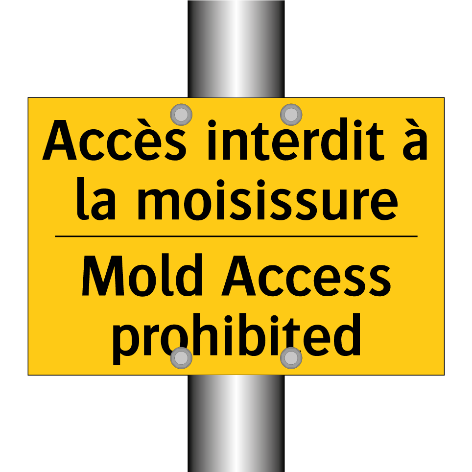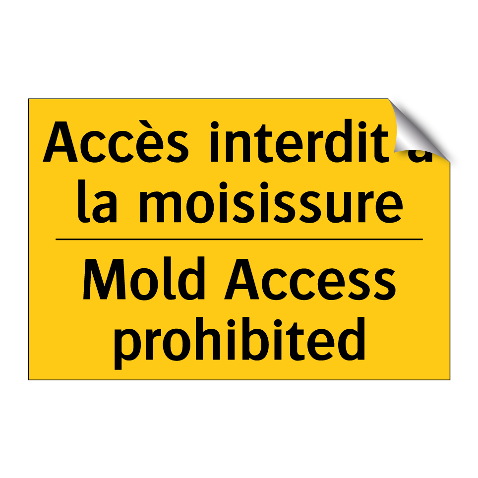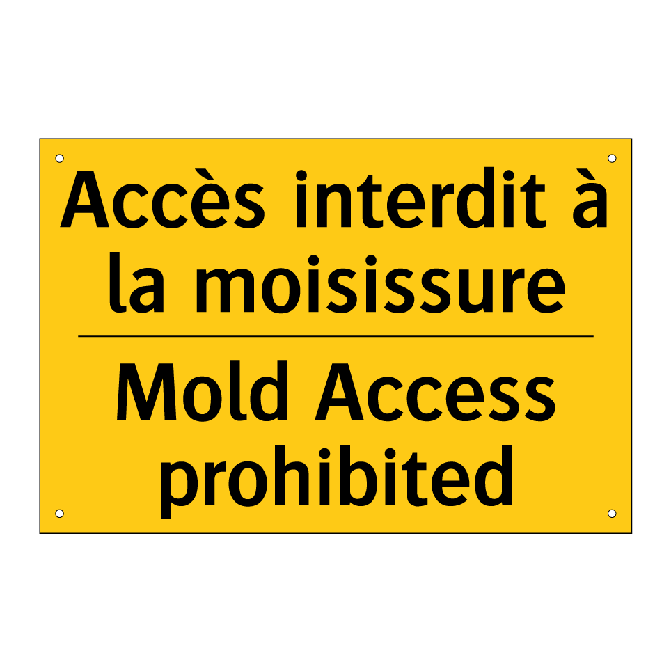 Panneau d'avertissement bilingue avec texte en français : "Accès interdit à la moisissure", et en anglais : "Mold Access prohibited"
